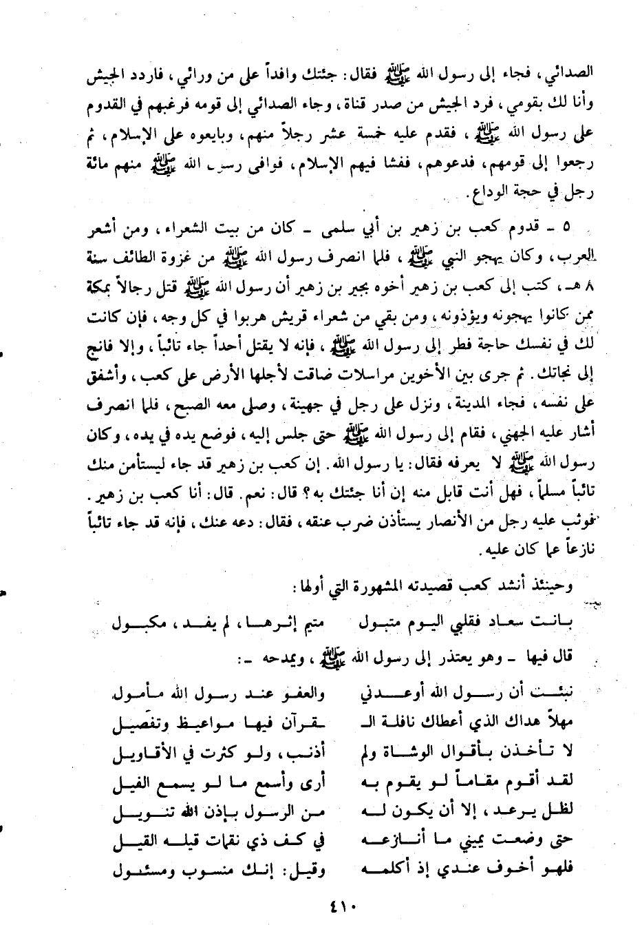 يا رسول الله. إن كعب بن زهير قد جاء ليستأمن منك تائبا مسلما، فهل أنت قابل منه إن أنا جئتك به؟ قال: نعم. قال: أنا كعب بن زهير. فوثب عليه رجل من الأنصار يستأذن ضرب عنقه، فقال: دعه عنك، فإنه قد جاء تائبا نازعا عما كان عليه.