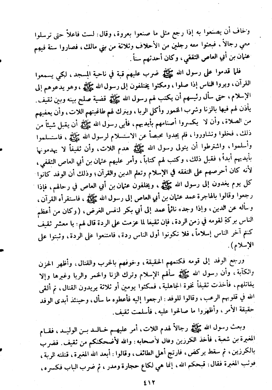 يأذن لهم فيها بالزنا وشرب الخمور وأكل الربا، ويترك لهم طاغيتهم اللات، وأن يعفيهم من الصلاة، وألايكسروا أصنامهم بأيديهم، فأبى رسول الله صلى الله عليه وسلم أن يقبل شيئا من ذلك، فخلوا وتشاوروا، فلم يجدوا محيصا عن الإستسلام لرسول الله صلى الله عليه وسلم، فاستسلموا وأسلموا، واشترطوا أن يتولى رسول الله صلى الله عليه وسلم هدم اللات، وأن ثقيفا لا يهدمونها بأيديهم أبدا، فقبل ذلك، وكتب لهم كتابا، وأمر عليهم عثمان بن أبي العاص الثقفي، لأنه كان أحرصهم على التفقه في الإسلام وتعلم الدين والقرآن. وذلك أن الوفد كانوا كل يوم يغدون إلى رسول الله صلى الله عليه وسلم، ويخلفون عثمان بن أبي العاص في رحالهم، فإذا رجعوا وقالوا بالهاجرة عمد عثمان بن أبي العاص إلى رسول الله صلى الله عليه وسلم، فاستقرأه القرآن، وسأله عن الدين، وإذا وجده نائما عمد إلى أبي بكر لنفس الغرض، (وكان من أعظم الناس بركة لقومه في زمن الردة، فإن ثقيفا لما عزمت على الردة قال لهم: يا معشر ثقيف كنتم آخر الناس إسلاما، فلا تكونوا أول الناس ردة، فامتنعوا على الردة، وثبتوا على الإسلام) .