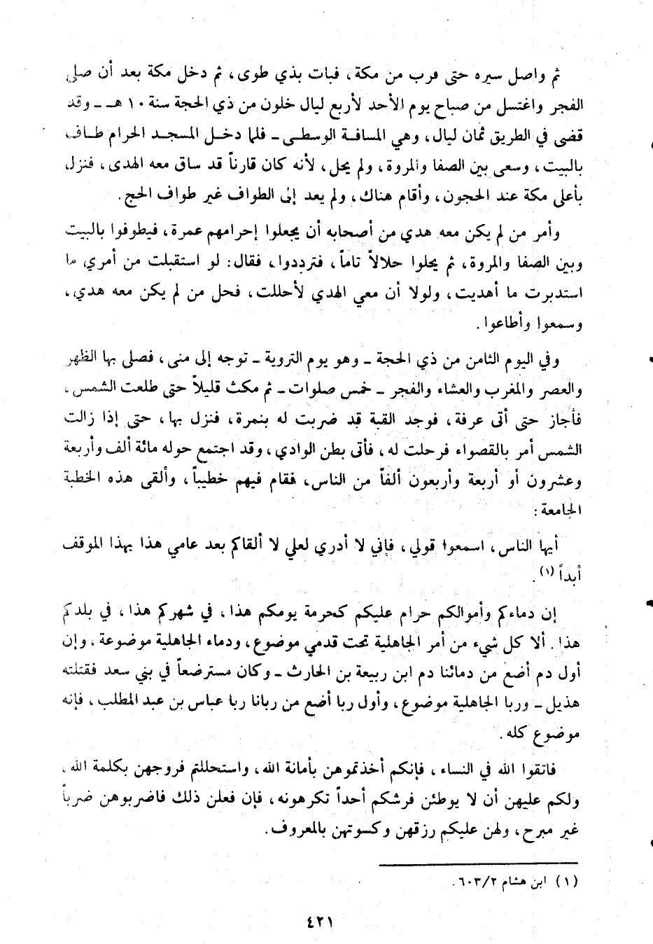 «إن دماءكم وأموالكم حرام عليكم كحرمة يومكم هذا، في شهركم هذا، في بلدكم هذا. ألا كل شيء من أمر الجاهلية تحت قدمي موضوع، ودماء الجاهلية موضوعة، وإن أول دم أضع من دمائنا دم ابن ربيعة بن الحارث- وكان مسترضعا في بني سعد فقتلته هذيل- وربا الجاهلية موضوع، وأول ربا أضع من ربانا ربا عباس بن عبد المطلب، فإنه موضوع كله» .