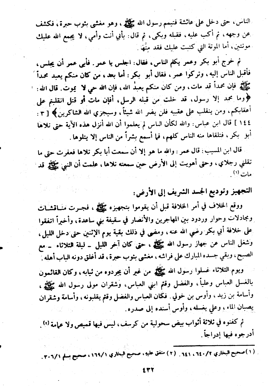 ثم خرج أبو بكر وعمر يكلم الناس، فقال: اجلس يا عمر. فأبى عمر أن يجلس، فأقبل الناس إليه، وتركوا عمر، فقال أبو بكر: أما بعد، من كان منكم يعبد محمدا صلى الله عليه وسلم فإن محمدا قد مات، ومن كان منكم يعبد الله، فإن الله حي لا يموت. قال الله: وَما مُحَمَّدٌ إِلَّا رَسُولٌ، قَدْ خَلَتْ مِنْ قَبْلِهِ الرُّسُلُ، أَفَإِنْ ماتَ أَوْ قُتِلَ انْقَلَبْتُمْ عَلى أَعْقابِكُمْ، وَمَنْ يَنْقَلِبْ عَلى عَقِبَيْهِ فَلَنْ يَضُرَّ اللَّهَ شَيْئاً، وَسَيَجْزِي اللَّهُ الشَّاكِرِينَ [آل عمران: 144] قال ابن عباس: والله لكأن الناس لم يعلموا أن الله أنزل هذه الآية حتى تلاها أبو بكر، فتلقاها منه الناس كلهم، فما أسمع بشرا من الناس إلا يتلوها.