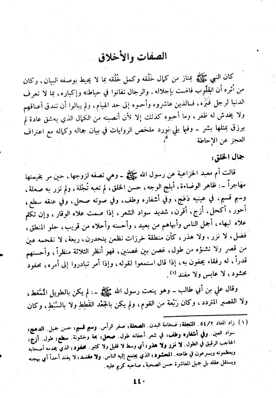 (1) زاد المعاد 2/ 54. الثجلة: ضخامة البدن. الصعلة: صغر الرأس. وسيم قسيم: حسن جميل. الدعج: سواد العين. وفي أشفاره وطف: في شعر أجفانه طول. صحل. بحة وخشونة. سطع: طول. أزج: الحاجب الرقيق في الطول. لا نزر ولا هذر: أي وسط لا قليل ولا كثير. محفود: الذي يخدمه أصحابه ويعظمونه ويسرعون في طاعته. المحشود: الذي يجتمع إليه الناس. ولا مفند: لا يفند أحدا أي يهجنه ويستقل عقله بل جميل المعاشرة حسن الصحبة، صاحبه كريم عليه.