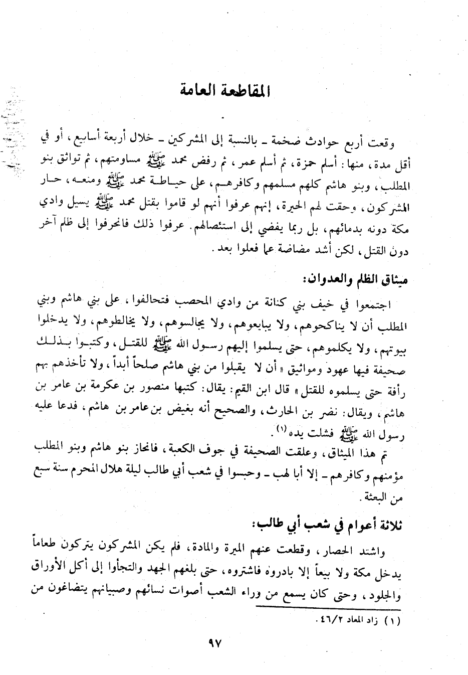اجتمعوا في خيف بني كنانة من وادي المحصب فتحالفوا، على بني هاشم وبني المطلب ألايناكحوهم، ولا يبايعوهم، ولا يجالسوهم، ولا يخالطوهم، ولا يدخلوا بيوتهم، ولا يكلموهم، حتى يسلموا إليهم رسول الله صلى الله عليه وسلم للقتل، وكتبوا بذلك صحيفة فيها عهود ومواثيق «ألايقبلوا من بني هاشم صلحا أبدا، ولا تأخذهم بهم رأفة حتى يسلموه، للقتل» قال ابن القيم: يقال: كتبها منصور بن عكرمة بن عامر بن هاشم، ويقال: نضر بن الحارث، والصحيح أنه بغيض بن عامر بن هاشم، فدعا عليه رسول الله صلى الله عليه وسلم فشلت يده «1» .