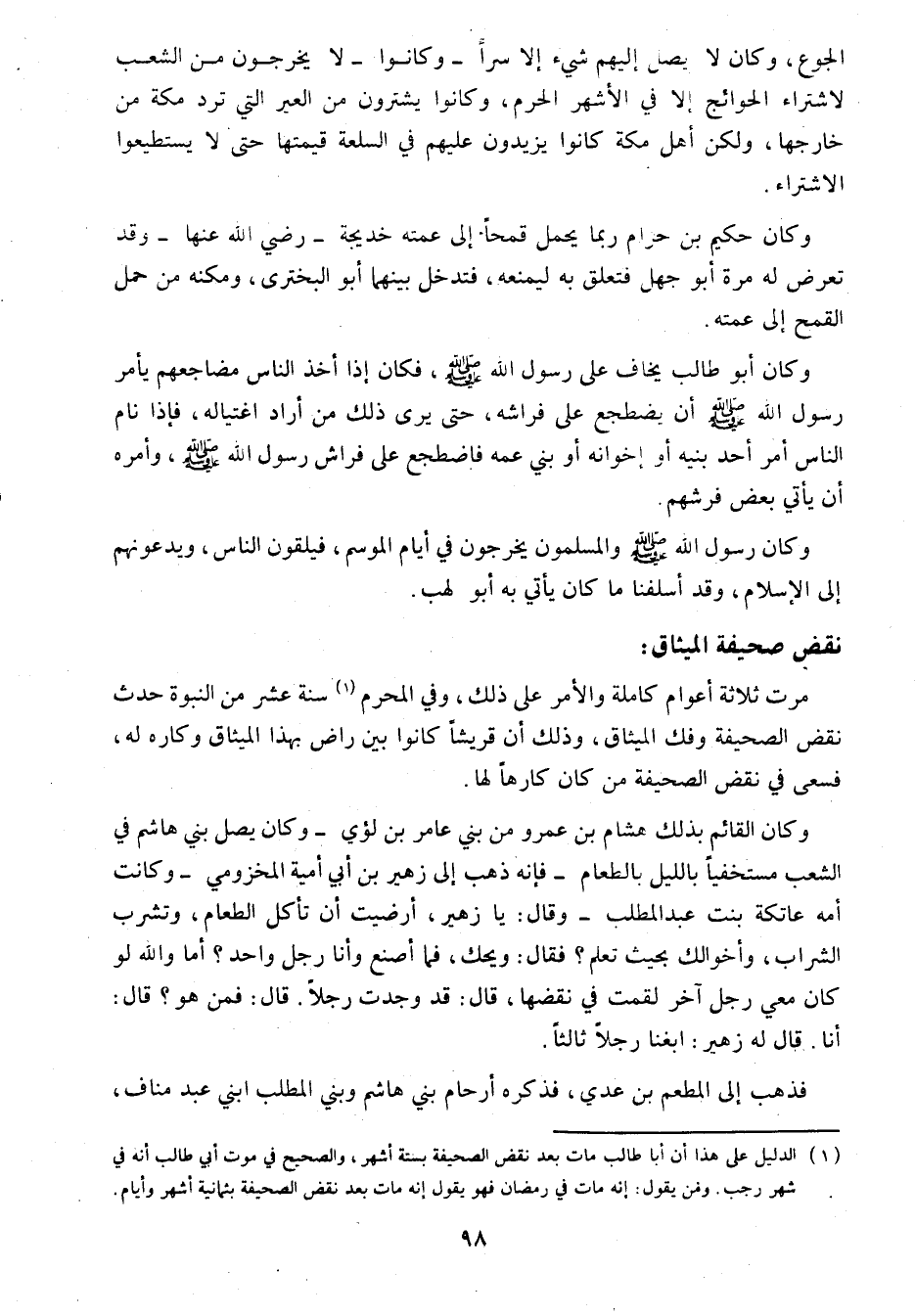 (1) الدليل على هذا أن أبا طالب مات بعد نقض الصحيفة بستة أشهر، والصحيح في موت أبي طالب أنه في شهر رجب. ومن يقول: إنه مات في رمضان فهو يقول: إنه مات بعد نقض الصحيفة بثمانية أشهر وأيام.