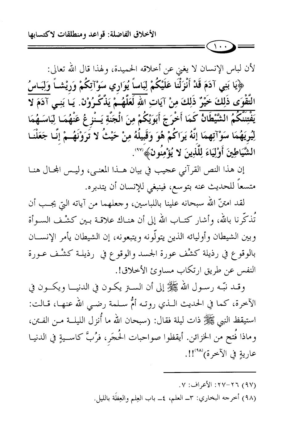 لقد امتنّ الله سبحانه علينا باللباسين، وجعلهما من آياته التي يجب أن تُذكّرنا بالله، وأشار كتاب الله إلى أن هناك علاقة بين كشْف السوأة وبين الشيطان وأوليائه الذين يتولّونه ويتبعونه، إن الشيطان يأمر الإنسان بالوقوع في رذيلة كشْف عورة الجسد والوقوع في رذيلة كشْف عورة النفس عن طريق ارتكاب مساوئ الأخلاق!.