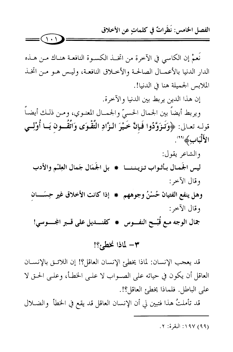 ويربط أيضاً بين الجمال الحسيّ والجمال المعنوي، ومن ذلك أيضاً قوله تعالى: {وَتَزَوَّدُوا فَإِنَّ خَيْرَ الزَّادِ التَّقْوَى وَاتَّقُونِ يَا أُوْلِي الأَلْبَابِ} 1.