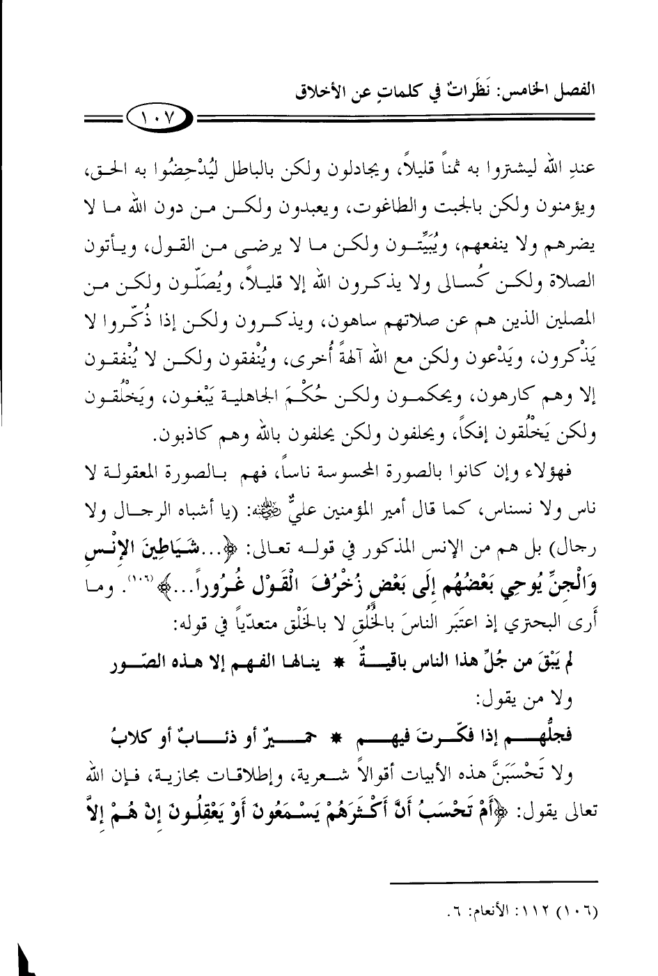 فهؤلاء وإن كانوا بالصورة المحسوسة ناساً، فهم بالصورة المعقولة لا ناس ولا نسناس، كما قال أمير المؤمنين عليٌّ رضي الله عنه: يا أشباه الرجال ولا رجال بل هم من الإنس المذكور في قوله تعالى: { ... شَيَاطِينَ الْأِنْسِ وَالْجِنِّ يُوحِي بَعْضُهُمْ إِلَى بَعْضٍ زُخْرُفَ الْقَوْلِ غُرُوراً ... } 1. وما أَرى البحتري إذ اعتَبَر الناسَ بالخُلُقِ لا بالخَلْق متعدّياً في قوله: