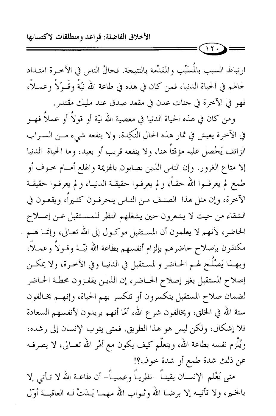 ارتباط السبب بالمُسَبِّب والمقدِّمة بالنتيجة. فحالُ الناس في الآخرة امتداد لحالهم في الحياة الدنيا، فمن كان في هذه في طاعة الله نيّةً وقَوْلاً وعملاً، فهو في الآخرة في جنات عدن في مقعد صدق عند مليك مقتدر.