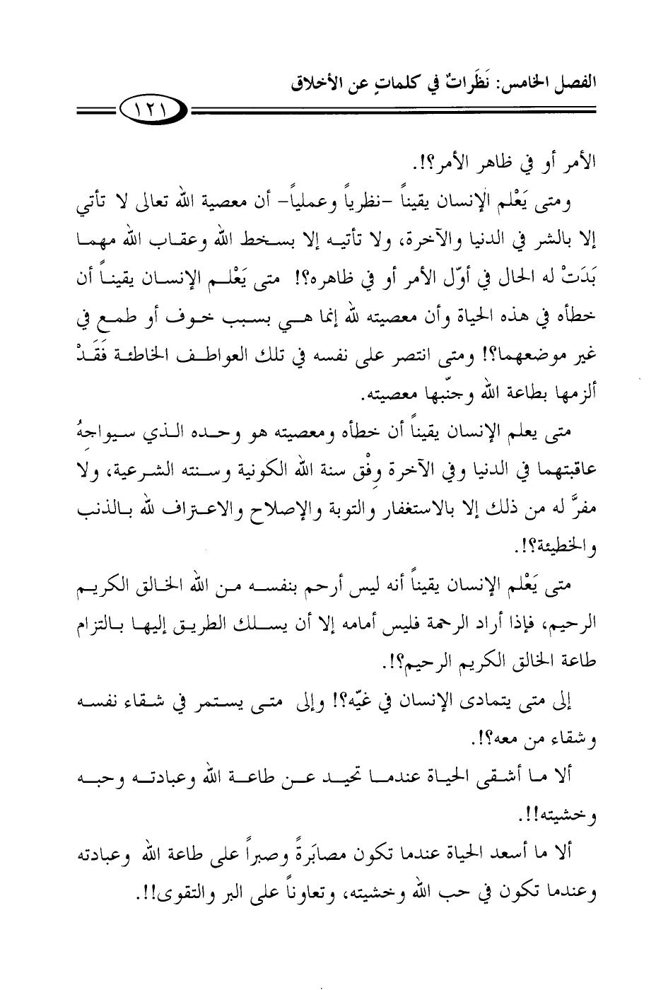 الأمر أو في ظاهره؟! متى يَعْلم الإنسان يقيناً أن خطأه في هذه الحياة وأن معصيته لله إنما هي بسبب خوف أو طمع في غير موضعهما؟! ومتى انتصر على نفسه في تلك العواطف الخاطئة فَقَدْ ألزمها بطاعة الله وجنّبها معصيته.