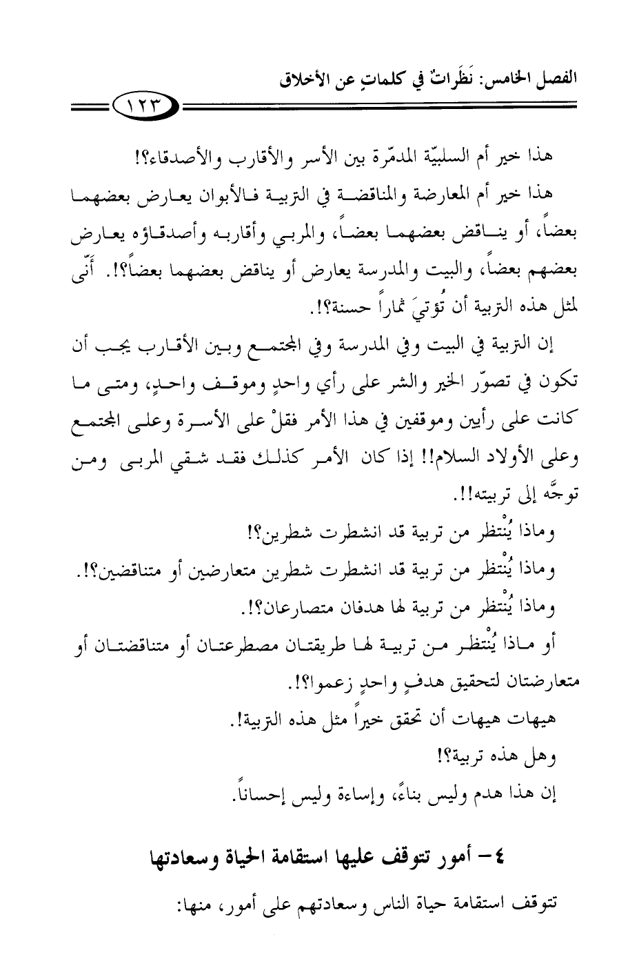 هذا خير أم المعارضة والمناقضة في التربية فالأبوان يعارض بعضهما بعضاً، أو يناقض بعضهما بعضاً، والمربي وأقاربه وأصدقاؤه يعارض بعضهم بعضاً، والبيت والمدرسة يعارض أو يناقض بعضهما بعضاً؟!. أَنّى لمثل هذه التربية أن تُؤتيَ ثماراً حسنة؟!.