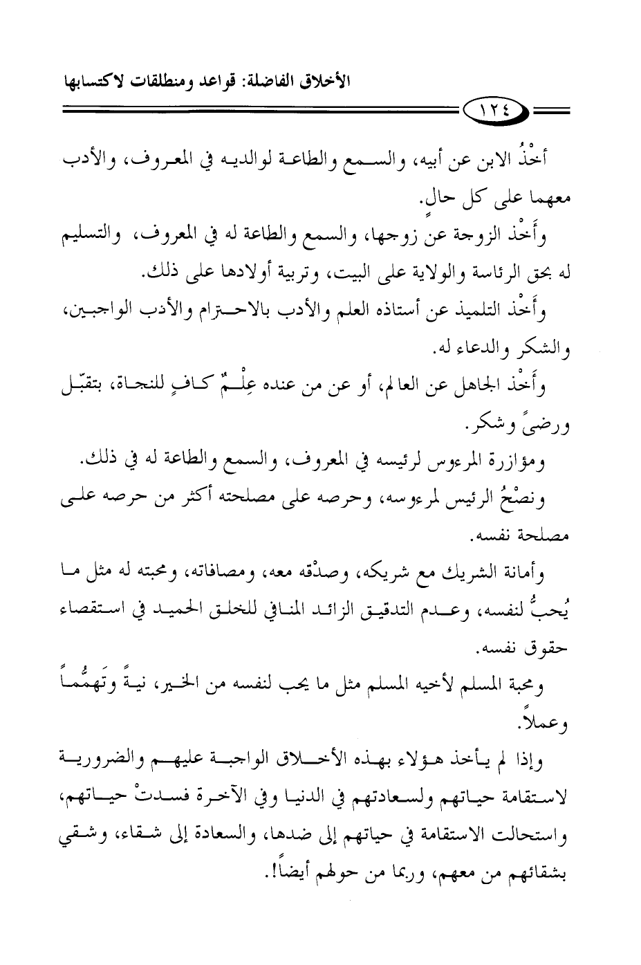 وإذا لم يأخذ هؤلاء بهذه الأخلاق الواجبة عليهم والضرورية لاستقامة حياتهم ولسعادتهم في الدنيا وفي الآخرة فسدتْ حياتهم، واستحالت الاستقامة في حياتهم إلى ضدها، والسعادة إلى شقاء، وشقي بشقائهم من معهم، وربما من حولهم أيضاً!.