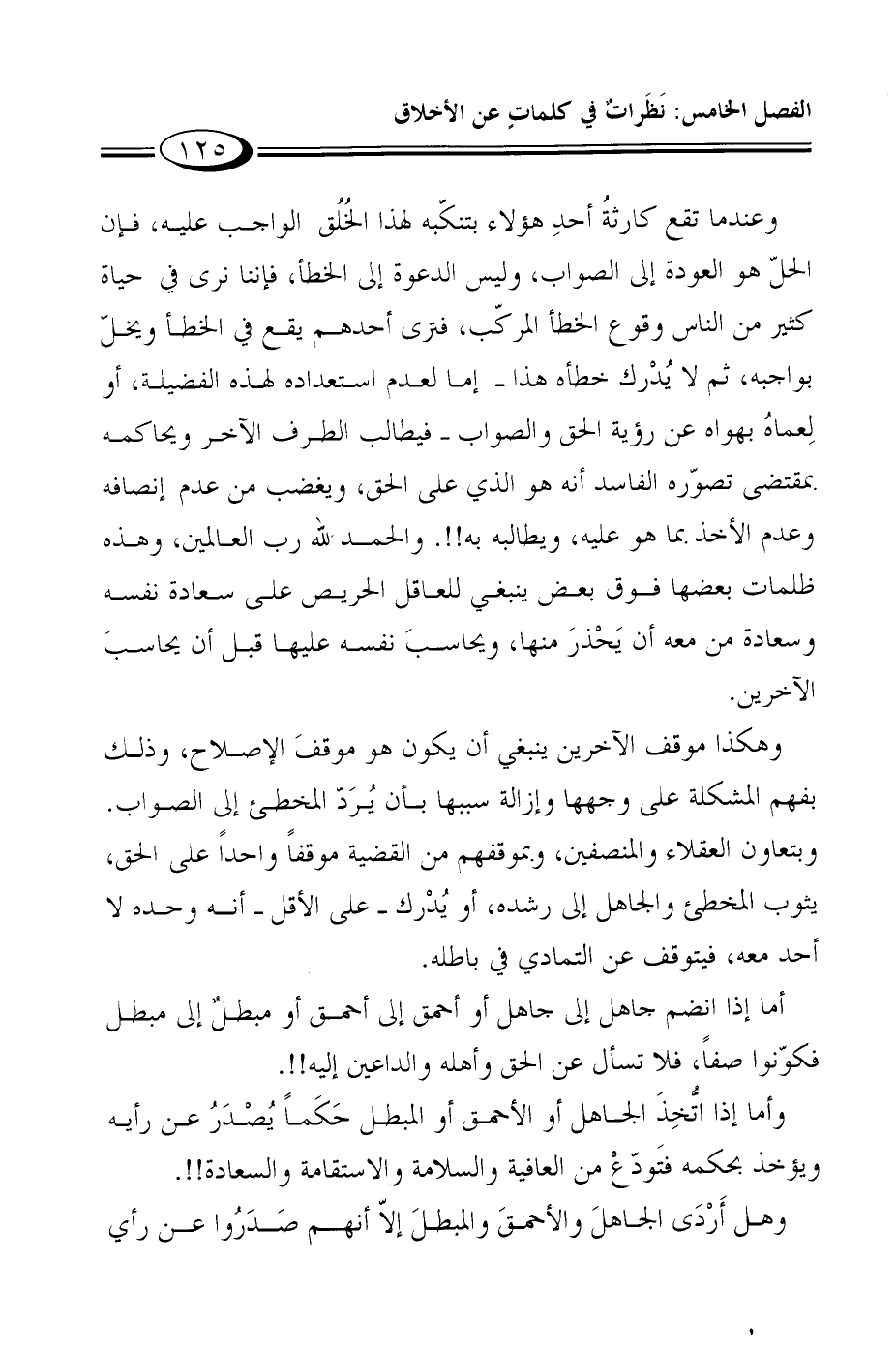 وعندما تقع كارثةُ أحدِ هؤلاء بتنكّبه لهذا الخُلُق الواجب عليه، فإن الحلّ هو العودة إلى الصواب، وليس الدعوة إلى الخطأ، فإننا نرى في حياة كثير من الناس وقوع الخطأ المركّب، فترى أحدهم يقع في الخطأ ويخلّ بواجبه، ثم لا يُدْرك خطأه هذا - إما لعدم استعداده لهذه الفضيلة، أو لِعماهُ بهواه عن رؤية الحق والصواب - فيطالب الطرف الآخر ويحاكمه بمقتضى تصوّره الفاسد أنه هو الذي على الحق، ويغضب من عدم إنصافه وعدم الأخذ بما هو عليه، ويطالبه به!!. والحمد لله رب العالمين، وهذه ظلمات بعضها فوق بعض ينبغي للعاقل الحريص على سعادة نفسه وسعادة من معه أن يَحْذرَ منها، ويحاسبَ نفسه عليها قبل أن يحاسبَ الآخرين.