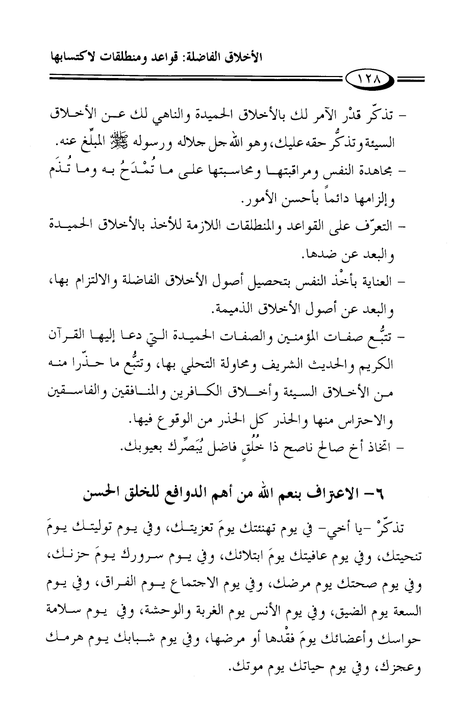 - العناية بأخْذ النفس بتحصيل أصول الأخلاق الفاضلة والالتزام بها، والبعد عن أصول الأخلاق الذميمة.