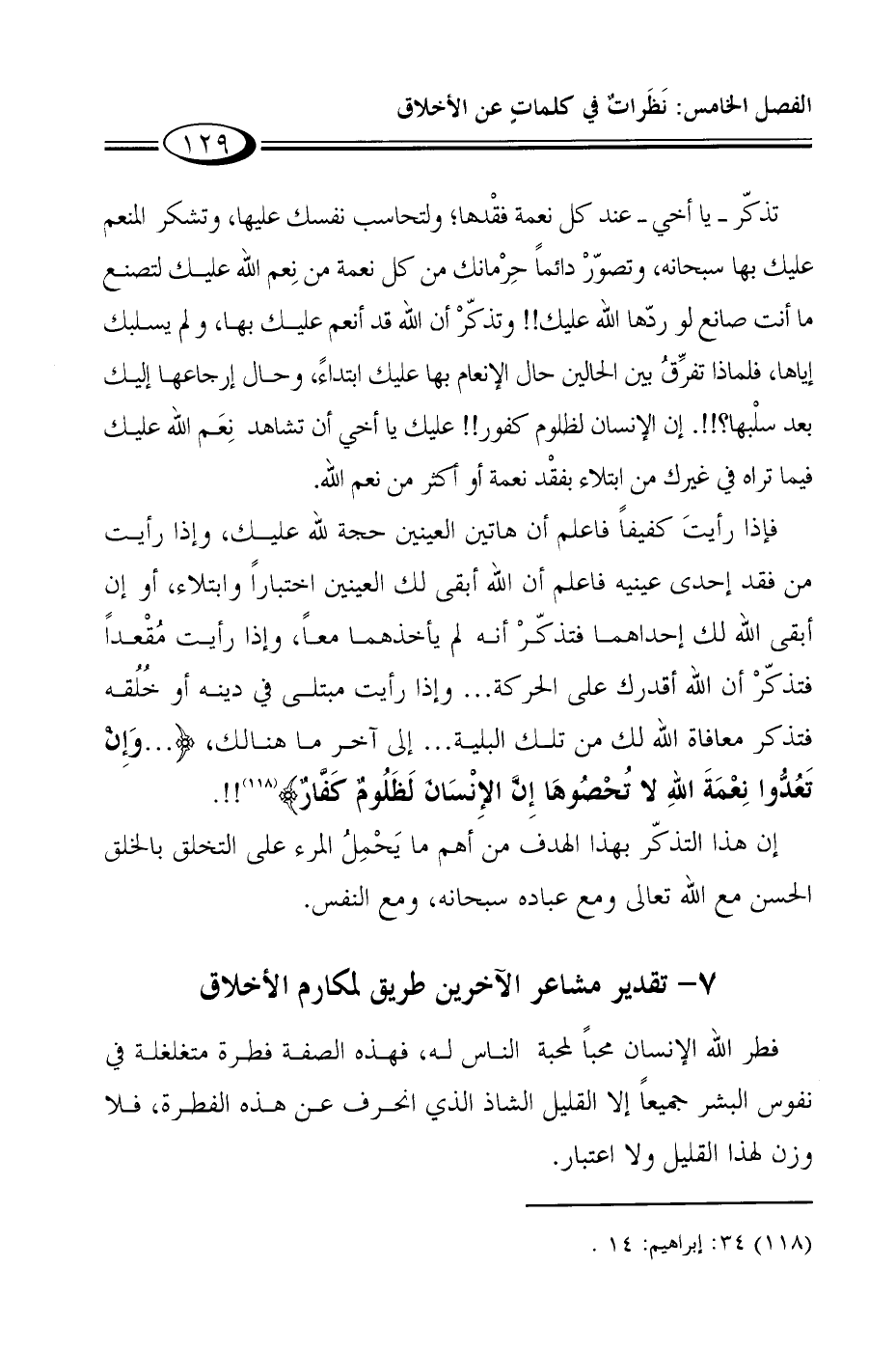 فإذا رأيتَ كفيفاً فاعلم أن هاتين العينين حجة لله عليك، وإذا رأيت من فقد إحدى عينيه فاعلم أن الله أبقى لك العينين اختباراً وابتلاء، أو إن أبقى الله لك إحداهما فتذكّرْ أنه لم يأخذهما معاً، وإذا رأيت مُقْعداً فتذكّرْ أن الله أقدرك على الحركة ... وإذا رأيت مبتلى في دينه أو خُلُقه فتذكر معافاة الله لك من تلك البلية ... إلى آخر ما هنالك، { ... وَإِنْ تَعُدُّوا نِعْمَتَ اللَّهِ لا تُحْصُوهَا إِنَّ الْأِنْسَانَ لَظَلُومٌ كَفَّارٌ} 1!!.