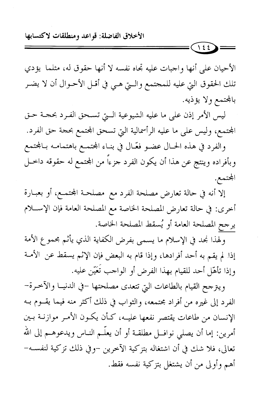 ولهذا نجد في الإسلام ما يسمى بفرض الكفاية الذي يأثم مجموع الأمة إذا لم يقم به أحد أفرادها، وإذا قام به البعض فإن الإثم يسقط عن الأمة وإذا تأهّل أحد للقيام بهذا الفرض أو الواجب تَعَيّن عليه.