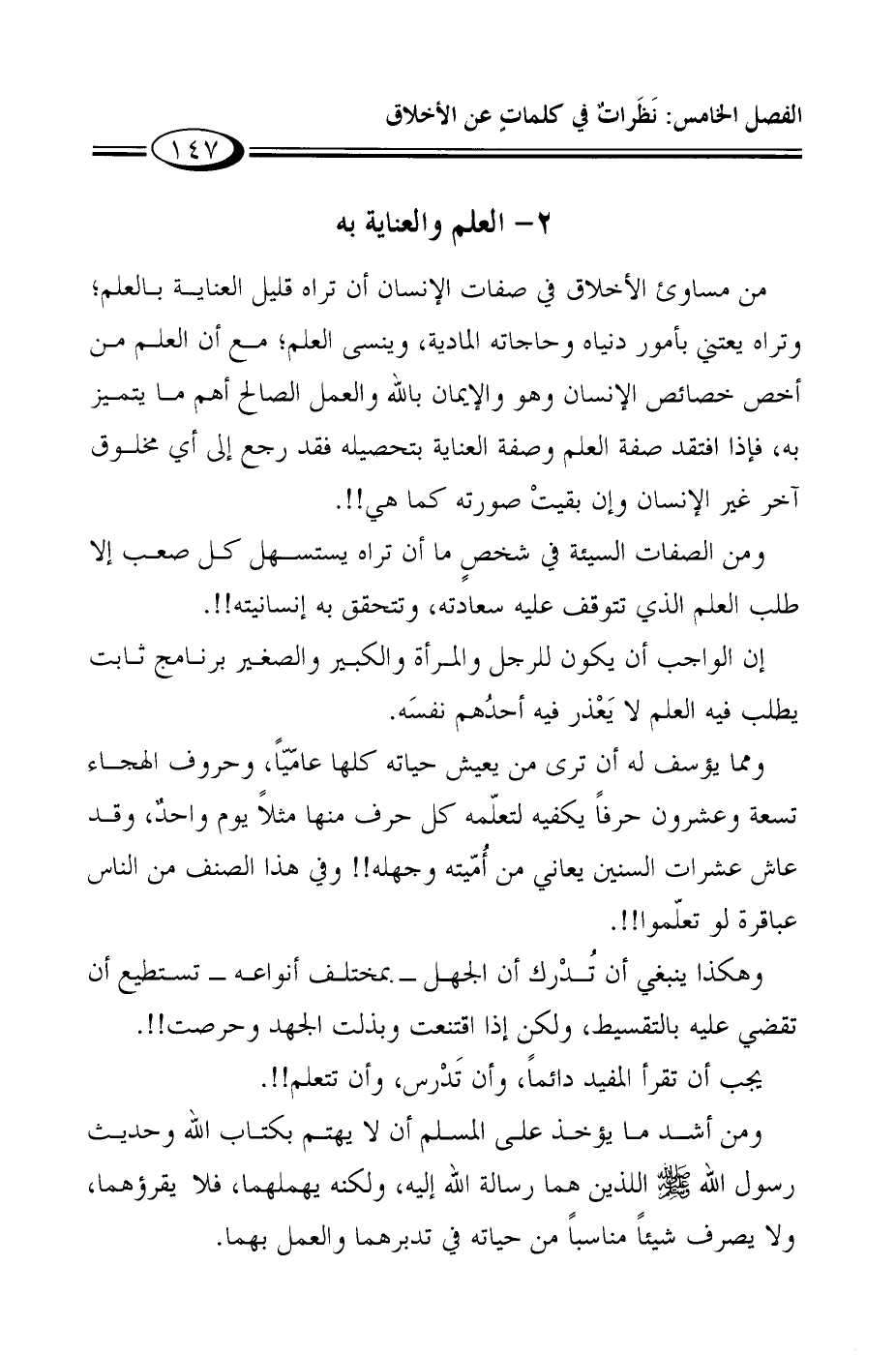 من مساوئ الأخلاق في صفات الإنسان أن تراه قليل العناية بالعلم؛ وتراه يعتني بأمور دنياه وحاجاته المادية، وينسى العلم؛ مع أن العلم من أخص خصائص الإنسان وهو والإيمان بالله والعمل الصالح أهم ما يتميز به، فإذا افتقد صفة العلم وصفة العناية بتحصيله فقد رجع إلى أي مخلوق آخر غير الإنسان وإن بقيتْ صورته كما هي!!.