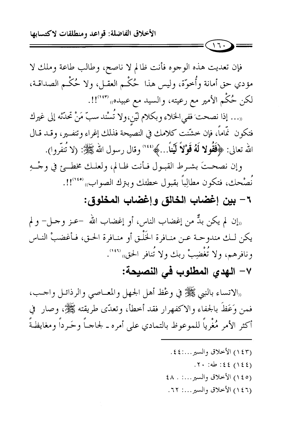 ... إذا نصحتَ ففي الخلاء وبكلام ليّنٍ، ولا تُسْند سبّ مَنْ تحدّثه إلى غيرك فتكون نمّاماً، فإن خشّنت كلامك في النصيحة فذلك إغراء وتنفير، وقد قال الله تعالى: {فَقُولا لَهُ قَوْلاً لَيِّناً ... } 2 وقال رسول الله صلى الله عليه وسلم: "لا تُنفّروا".