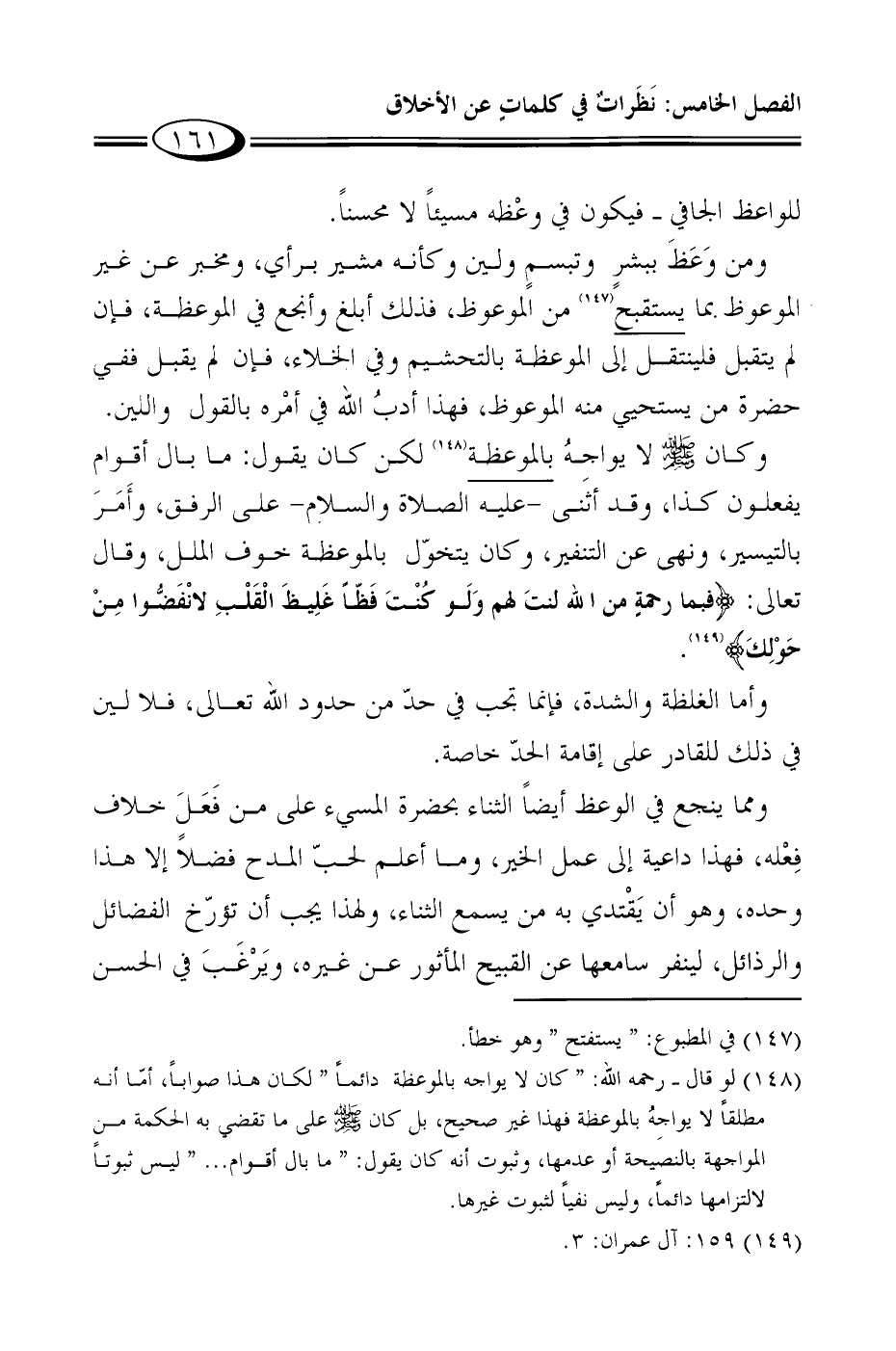 2 لو قال - رحمه الله: "كان لا يواجه بالموعظة دائماً" لكان هذا صواباً، أمّا أنه مطلقاً لا يواجِهُ بالموعظة فهذا غير صحيح، بل كان صلى الله عليه وسلم على ما تقضي به الحكمة من المواجهة بالنصيحة أو عدمها، وثبوت أنه كان يقول: "ما بال أقوام ... " ليس ثبوتاً لالتزامها دائماً، وليس نفياً لثبوت غيرها.