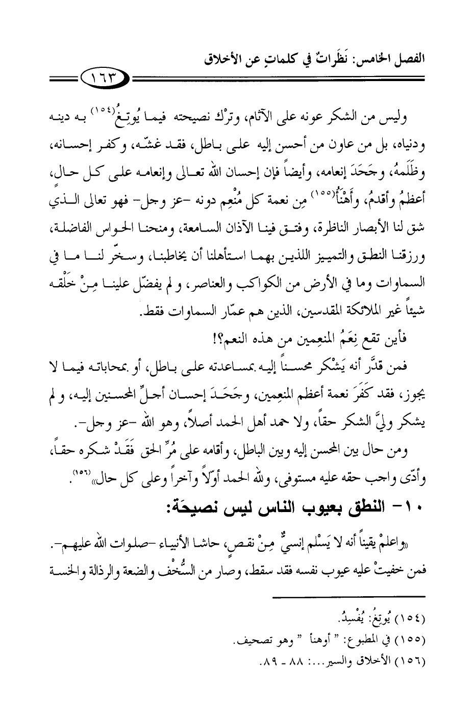 "واعلمْ يقيناً أنه لا يَسْلم إنسيٌّ مِنْ نقصٍ، حاشا الأنبياء -صلوات الله عليهم-. فمن خفيتْ عليه عيوب نفسه فقد سقط، وصار من السُّخْف والضعة والرذالة والخسة