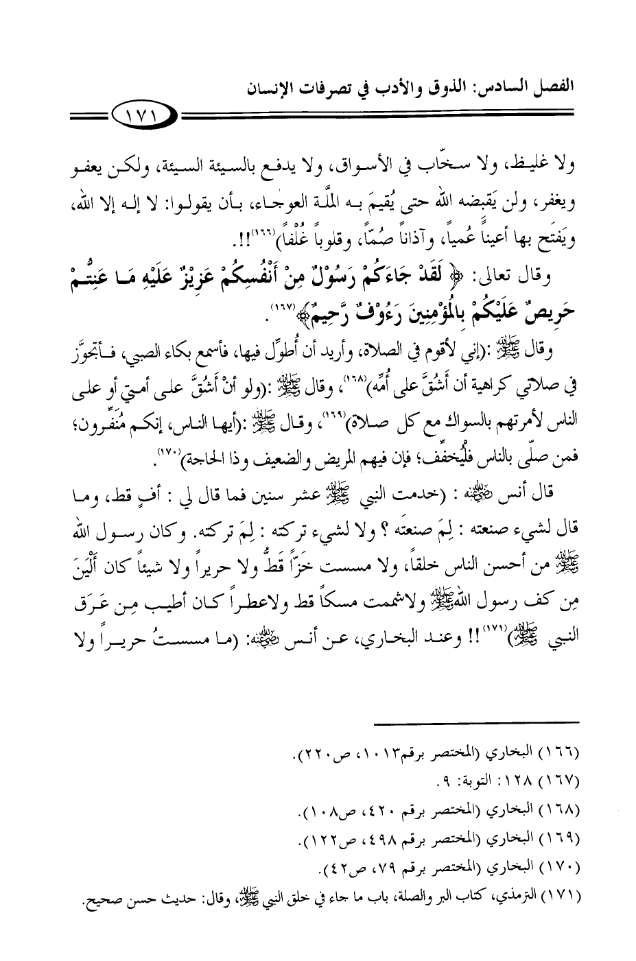 قال أنس رضي الله عنه: "خدمت النبي صلى الله عليه وسلم عشر سنين فما قال لي: أفٍ قط، وما قال لشيء صنعته: لِمَ صنعتَه؟ ولا لشيء تركته: لِمَ تركته. وكان رسول الله صلى الله عليه وسلم من أحسن الناس خلقاً، ولا مسست خَزّاً قَطُّ ولا حريراً ولا شيئاً كان أَلْيَنَ مِن كف رسول الله صلى الله عليه وسلم ولاشممت مسكاً قط ولاعطراً كان أطيب مِن عَرَق" النبي صلى الله عليه وسلم6"!! وعند البخاري، عن أنس رضي الله عنه: "ما مسستُ حريراً ولا