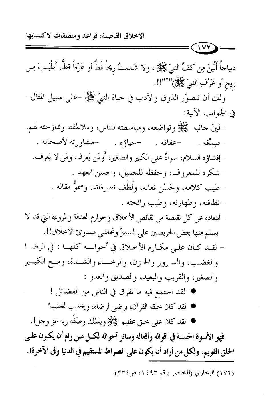 - لقد كان على مكارم الأخلاق في أحواله كلها: في الرضا والغضب، والسرور والحزن، والرخاء والشدة، ومع الكبير والصغير، والقريب والبعيد، والصديق والعدو: