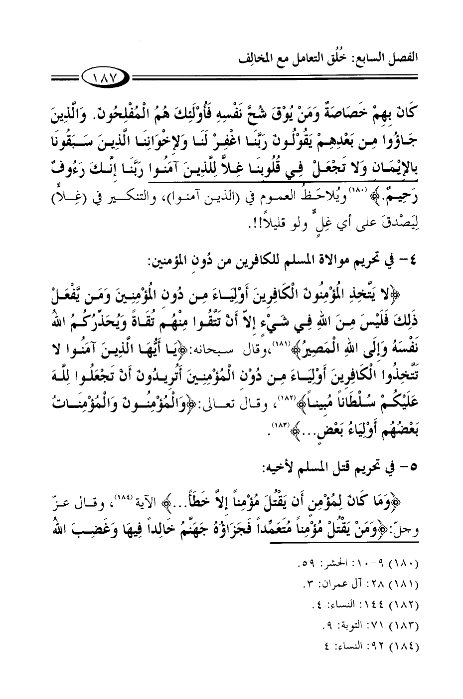 {لا يَتَّخِذِ الْمُؤْمِنُونَ الْكَافِرِينَ أَوْلِيَاءَ مِنْ دُونِ الْمُؤْمِنِينَ وَمَنْ يَفْعَلْ ذَلِكَ فَلَيْسَ مِنَ اللَّهِ فِي شَيْءٍ إِلَّا أَنْ تَتَّقُوا مِنْهُمْ تُقَاةً وَيُحَذِّرُكُمُ اللَّهُ نَفْسَهُ وَإِلَى اللَّهِ الْمَصِيرُ} 2،وقال سبحانه: {يَا أَيُّهَا الَّذِينَ آمَنُوا لا تَتَّخِذُوا الْكَافِرِينَ أَوْلِيَاءَ مِنْ دُونِ الْمُؤْمِنِينَ أَتُرِيدُونَ أَنْ تَجْعَلُوا لِلَّهِ عَلَيْكُمْ سُلْطَاناً مُبِيناً} 3، وقال تعالى: {وَالْمُؤْمِنُونَ وَالْمُؤْمِنَاتُ بَعْضُهُمْ أَوْلِيَاءُ بَعْضٍ ... } 4.