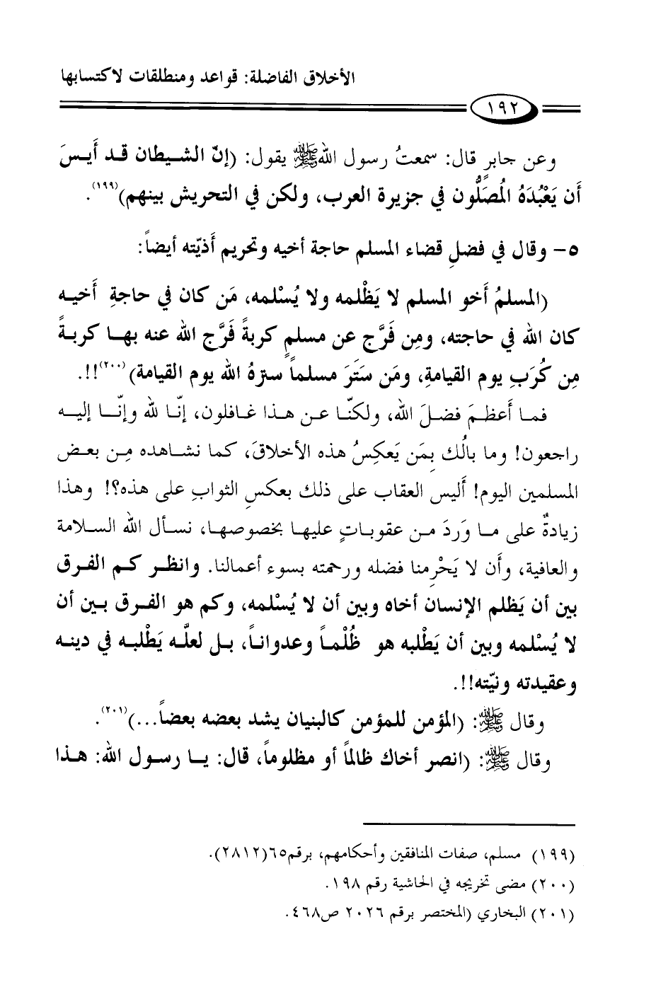 فما أَعظمَ فضلَ الله، ولكنّا عن هذا غافلون، إنّا لله وإنّا إليه راجعون! وما بالُك بِمَن يَعكِسُ هذه الأخلاقَ، كما نشاهده مِن بعض المسلمين اليوم! أَليس العقاب على ذلك بعكسِ الثوابِ على هذه؟! وهذا زيادةٌ على ما وَردَ من عقوباتٍ عليها بخصوصها، نسأل الله السلامة والعافية، وأَن لا يَحْرِمنا فضله ورحمته بسوء أعمالنا. وانظر كم الفرق بين أن يَظلم الإنسان أخاه وبين أن لا يُسْلمه، وكم هو الفرق بين أن لا يُسْلمه وبين أن يَطْلبه هو ظُلْماً وعدواناً، بل لعلَّه يَطْلبه في دينه وعقيدته ونيّته!!.