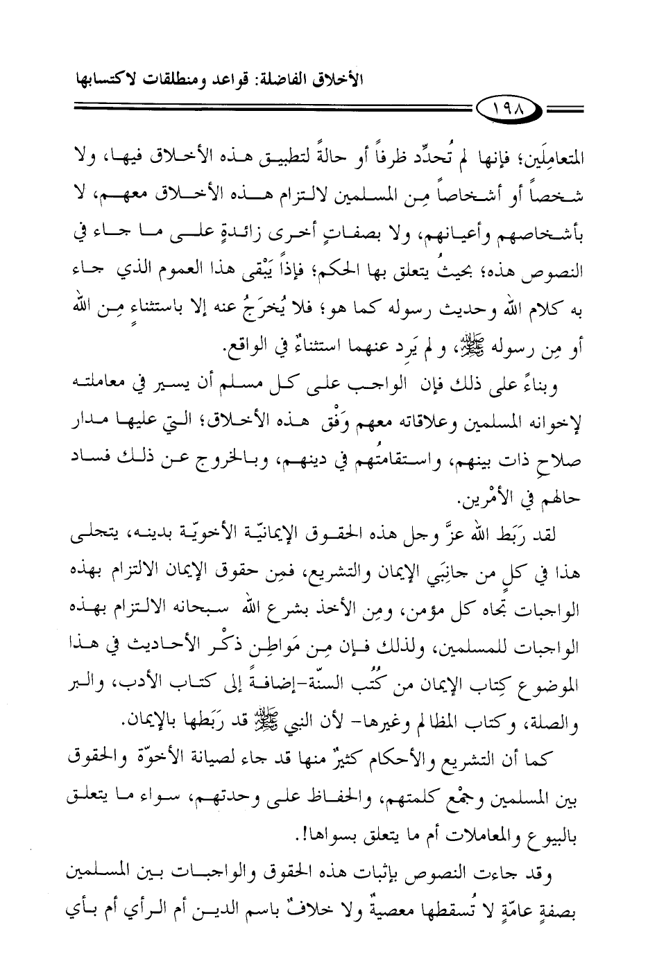 المتعامِلَين؛ فإنها لم تُحدِّد ظرفاً أو حالةً لتطبيق هذه الأخلاق فيها، ولا شخصاً أو أشخاصاً مِن المسلمين لالتزام هذه الأخلاق معهم، لا بأشخاصهم وأعيانهم، ولا بصفاتٍ أخرى زائدةٍ على ما جاء في النصوص هذه؛ بحيثُ يتعلق بها الحكم؛ فإذَنْ يَبْقى هذا العموم الذي جاء به كلام الله وحديث رسوله كما هو؛ فلا يُخرَجُ عنه إلا باستثناءٍ مِن الله أو مِن رسوله صلى الله عليه وسلم، ولم يَرِد عنهما استثناءٌ في الواقع.