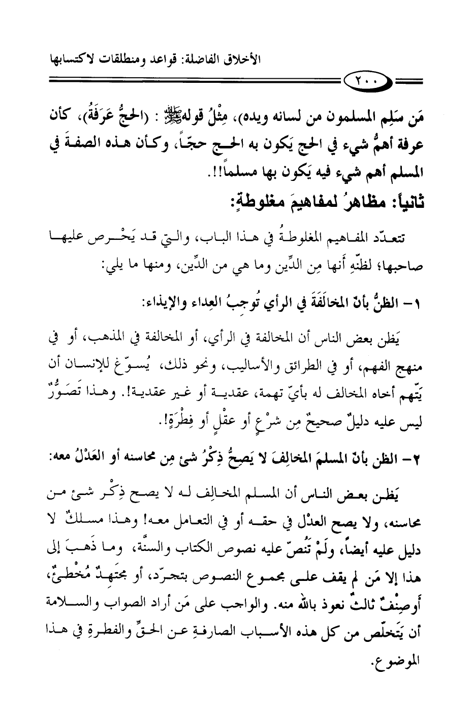 مَن سَلِم المسلمون من لسانه ويده"، مِثْلُ قوله صلى الله عليه وسلم: "الحجُّ عَرَفَةُ"، كأن عرفة أهمُّ شيء في الحج يَكون به الحج حجّاً، وكأن هذه الصفةَ في المسلم أهم شيء فيه يَكون بها مسلماً!!.