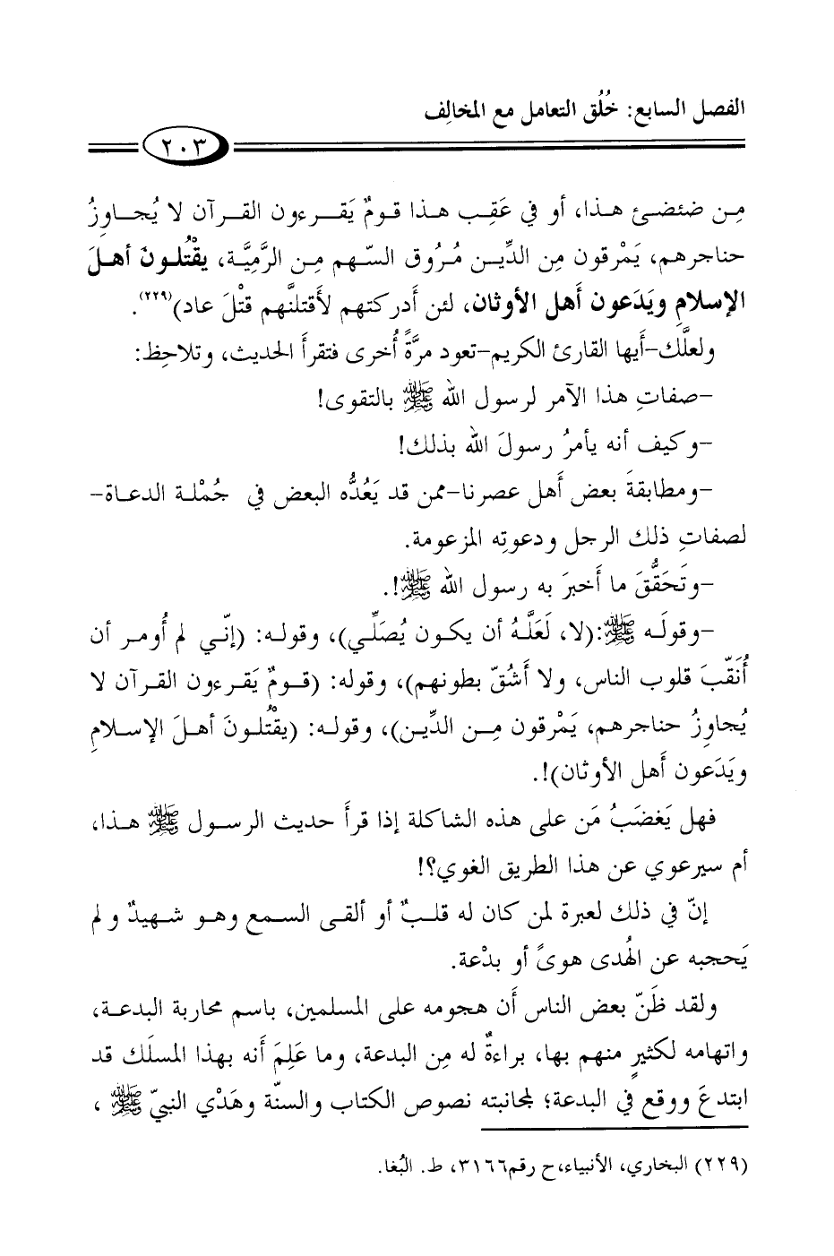 -وقوله صلى الله عليه وسلم: "لا، لَعَلَّهُ أن يكون يُصَلِّي"، وقوله: "إنّي لم أُومر أن أُنَقّبَ قلوب الناس، ولا أَشُقّ بطونهم"، وقوله: "قومٌ يَقرءون القرآن لا يُجاوِزُ حناجرهم، يَمْرقون مِن الدِّين"، وقوله: "يقْتُلونَ أهلَ الإسلامِ ويَدَعون أَهل الأوثان"!.