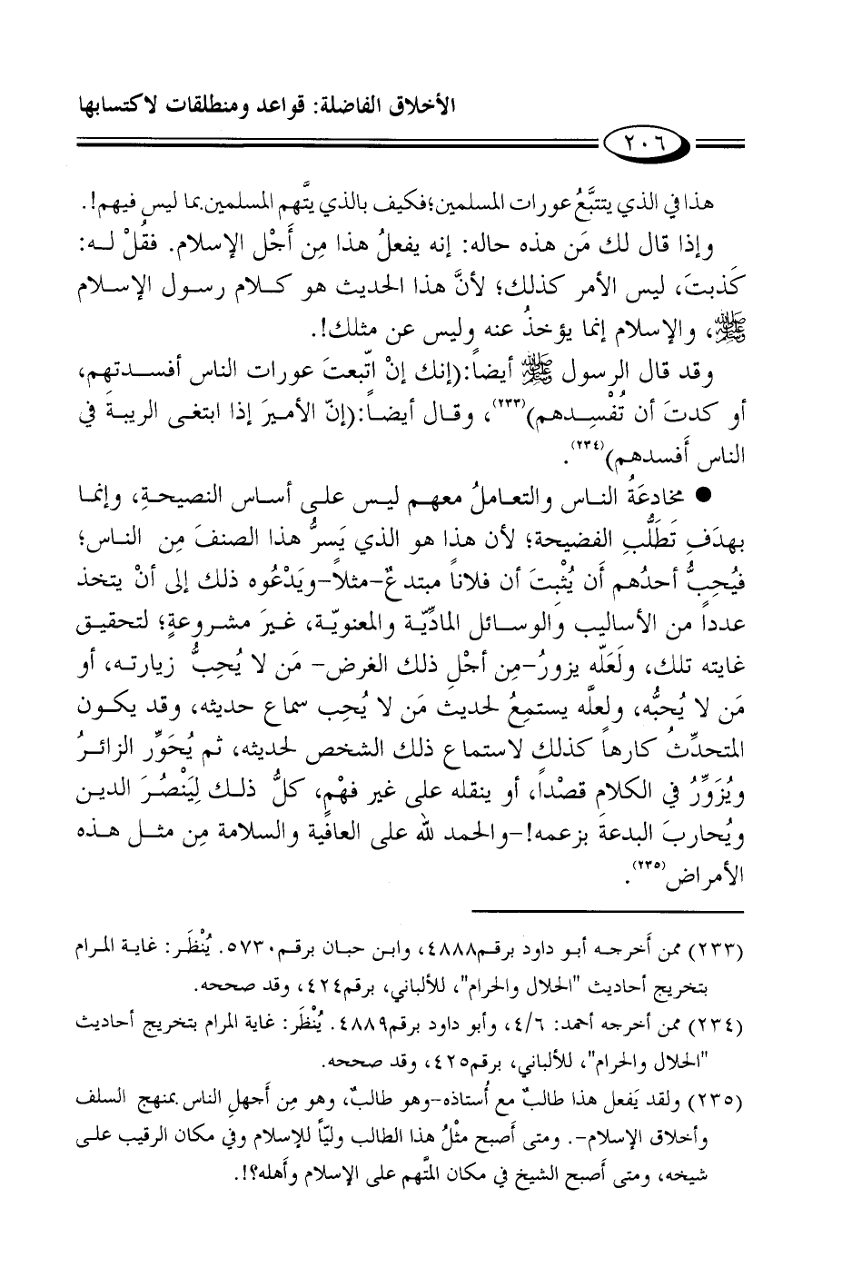 وقد قال الرسول صلى الله عليه وسلم أيضاً: "إنك إنْ اتّبعتَ عورات الناس أفسدتهم، أو كدتَ أن تُفْسِدهم" 1، وقال أيضاً: "إنّ الأميرَ إذا ابتغى الريبةَ في الناس أَفسدهم" 2.