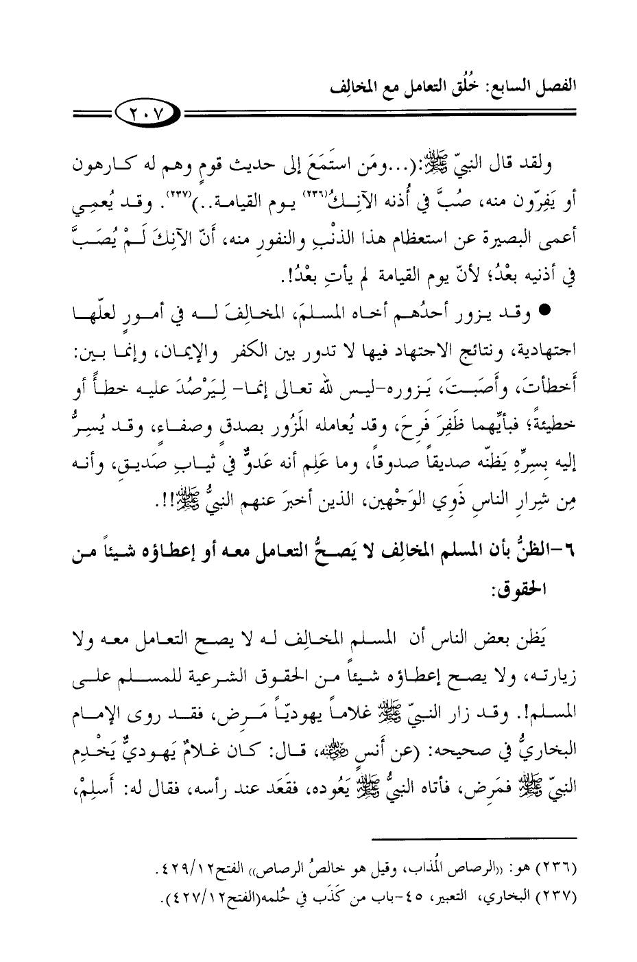 يَظن بعض الناس أن المسلم المخالِف له لا يصح التعامل معه ولا زيارته، ولا يصح إعطاؤه شيئاً من الحقوق الشرعية للمسلم على المسلم!. وقد زار النبيّ صلى الله عليه وسلم غلاماً يهوديّاً مَرِض، فقد روى الإمام البخاريُّ في صحيحه: عن أَنسٍ رضي الله عنه، قال: "كان غلامٌ يَهوديٌّ يَخْدِم النبيّ صلى الله عليه وسلم فمَرِض، فأتاه النبيُّ صلى الله عليه وسلم يَعُوده، فقَعَد عند رأسه، فقال له: أَسلِ مْ،