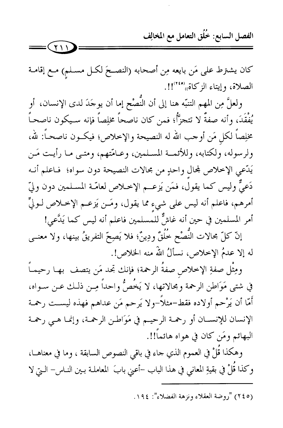 كان يشترط على مَن بايعه مِن أصحابه النصحَ لكل مسلمٍ مع إقامة الصلاة، وإيتاء الزكاة1!!.