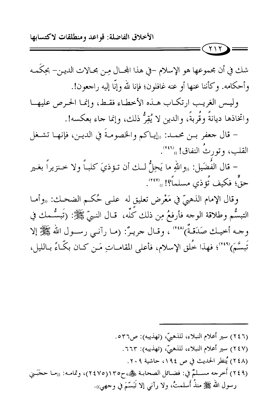 وقال الإمام الذهبيّ في مَعْرض تعليقٍ له على حُكم الضحك: وأما التبسُّم وطلاقة الوجه فأرفعُ مِن ذلك كلِّه، قال النبيّ صلى الله عليه وسلم: "تَبسُّمك في وجه أخيك صَدَقةٌ" 3، وقال جريرٌ: "ما رآني رسول الله صلى الله عليه وسلم إلا تَبسَّمَ" 4؛ فهذا خُلق الإسلام، فأعلى المقاماتِ مَن كان بكّاءً بالليل،