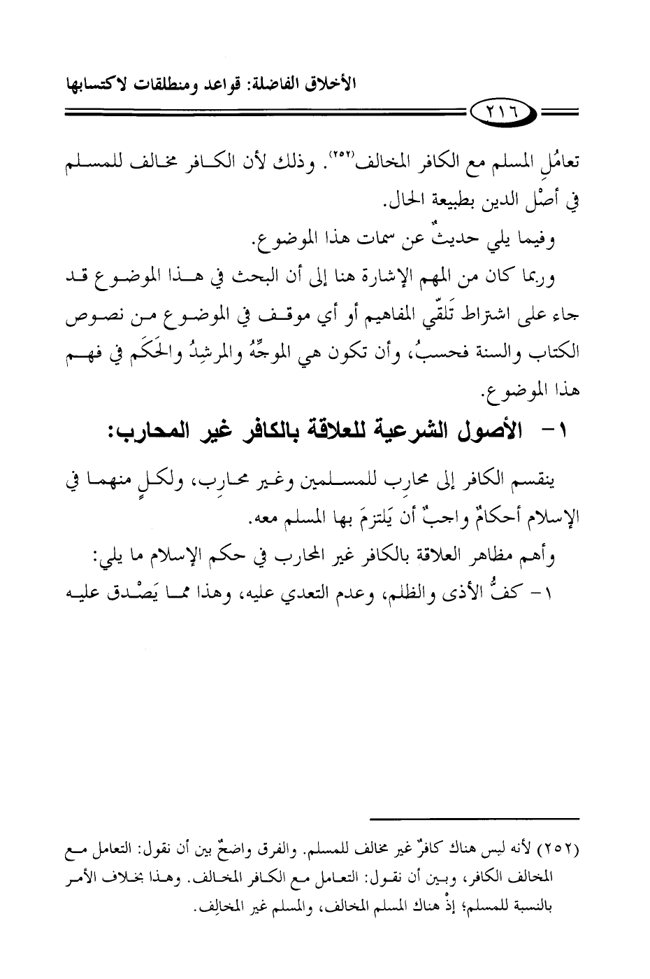 1 لأنه ليس هناك كافرٌ غير مخالف للمسلم. والفرق واضحٌ بين أن نقول: التعامل مع المخالف الكافر، وبين أن نقول: التعامل مع الكافر المخالف. وهذا بخلاف الأمر بالنسبة للمسلم؛ إذْ هناك المسلم المخالف، والمسلم غير المخالِف.