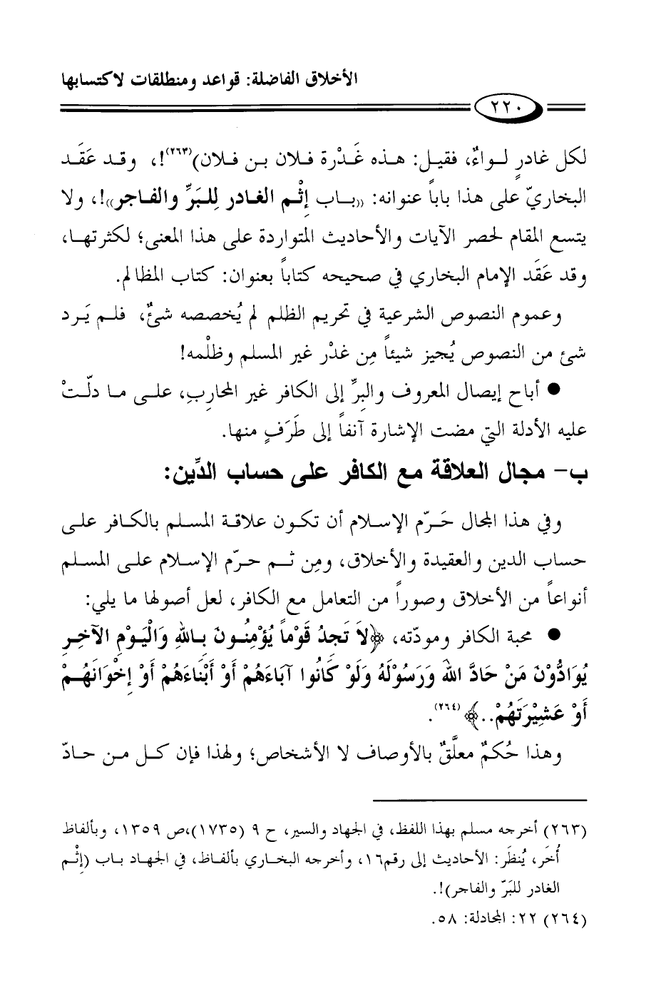 يوم القيامة" 1، وقوله: "إذا جمع الله الأولين والآخرين يوم القيامة، يُرْفَع لكل غادرٍ لواءٌ، فقيل: هذه غَدْرة فلان بن فلان" 2!، وقد عَقَد البخاريّ على هذا باباً عنوانه: "باب إِثْم الغادر لِلبَرِّ والفاجر! "، ولا يتسع المقام لحصر الآيات والأحاديث المتواردة على هذا المعنى؛ لكثرتها، وقد عَقَد الإمام البخاري في صحيحه كتاباً بعنوان: كتاب المظالم.