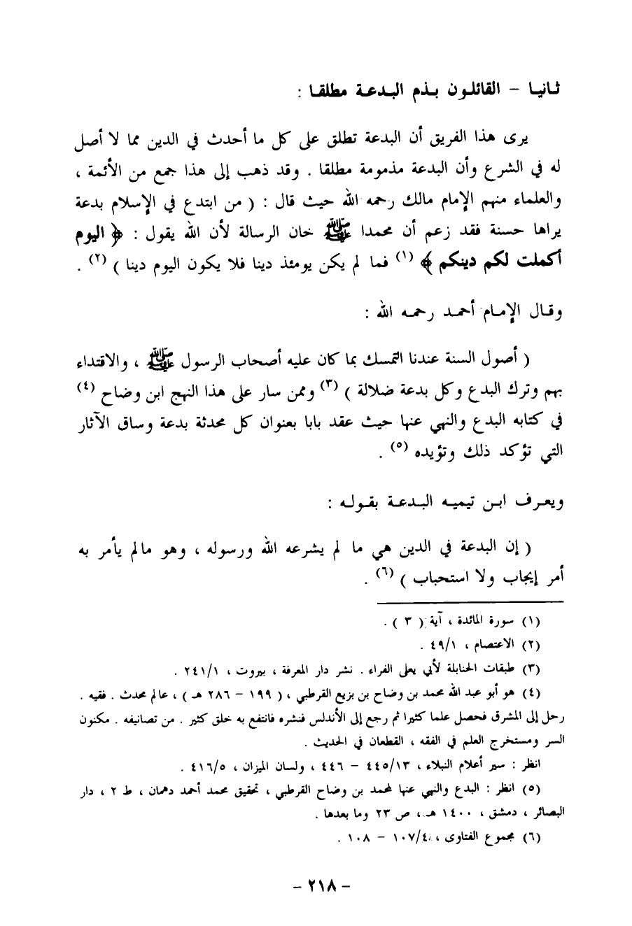(¬5) انظر: البدع والنهي عنها لمحمد بن وضاح القرطبي، تحقيق محمد أحمد دهمان، ط 2، دار البصائر، دمشق، 1400هـ ص23 وما بعدها.