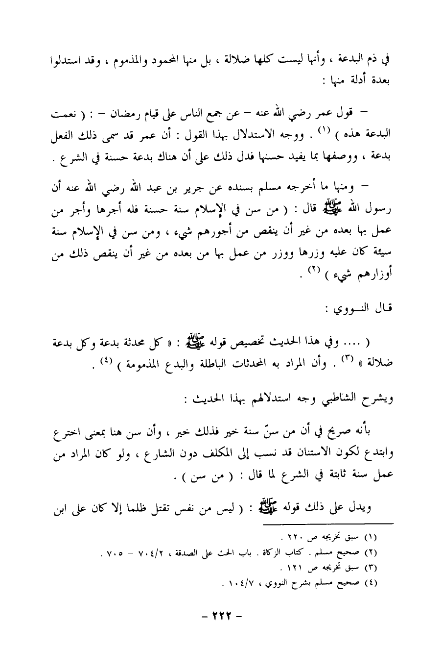 في ذم البدعة، وأنها ليست كلها ضلالة، بل منها المحمود والمذموم، وقد استدلوا بعدة أدلة منها: