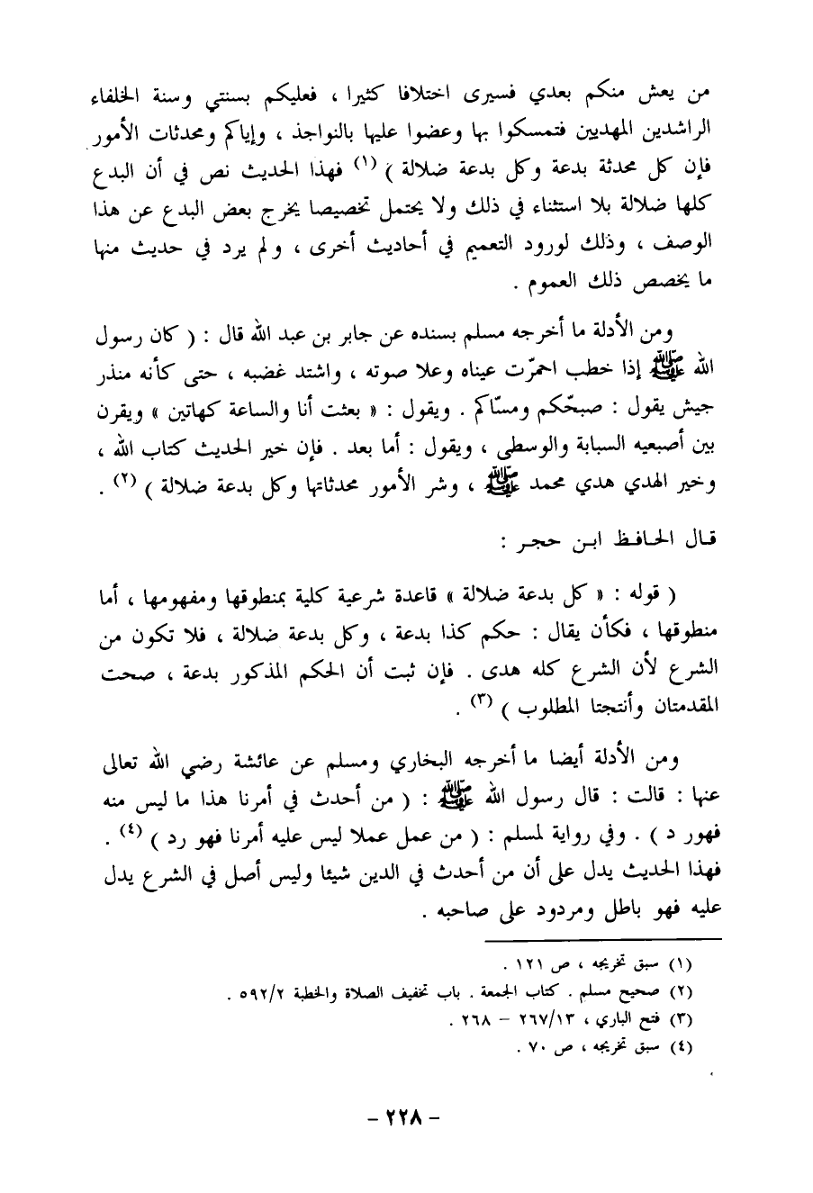 (قوله: «كل بدعة ضلالة» قاعدة شرعية كلية بمنطوقها ومفهومها، أما منطوقها، فكأن يقال: حكم كذا بدعة، وكل بدعة ضلالة، فلا تكون من الشرع لأن الشرع كله هدى. فإن ثبت أن الحكم المذكور بدعة، صحت المقدمتان وأنتجتا المطلوب) (¬3) .