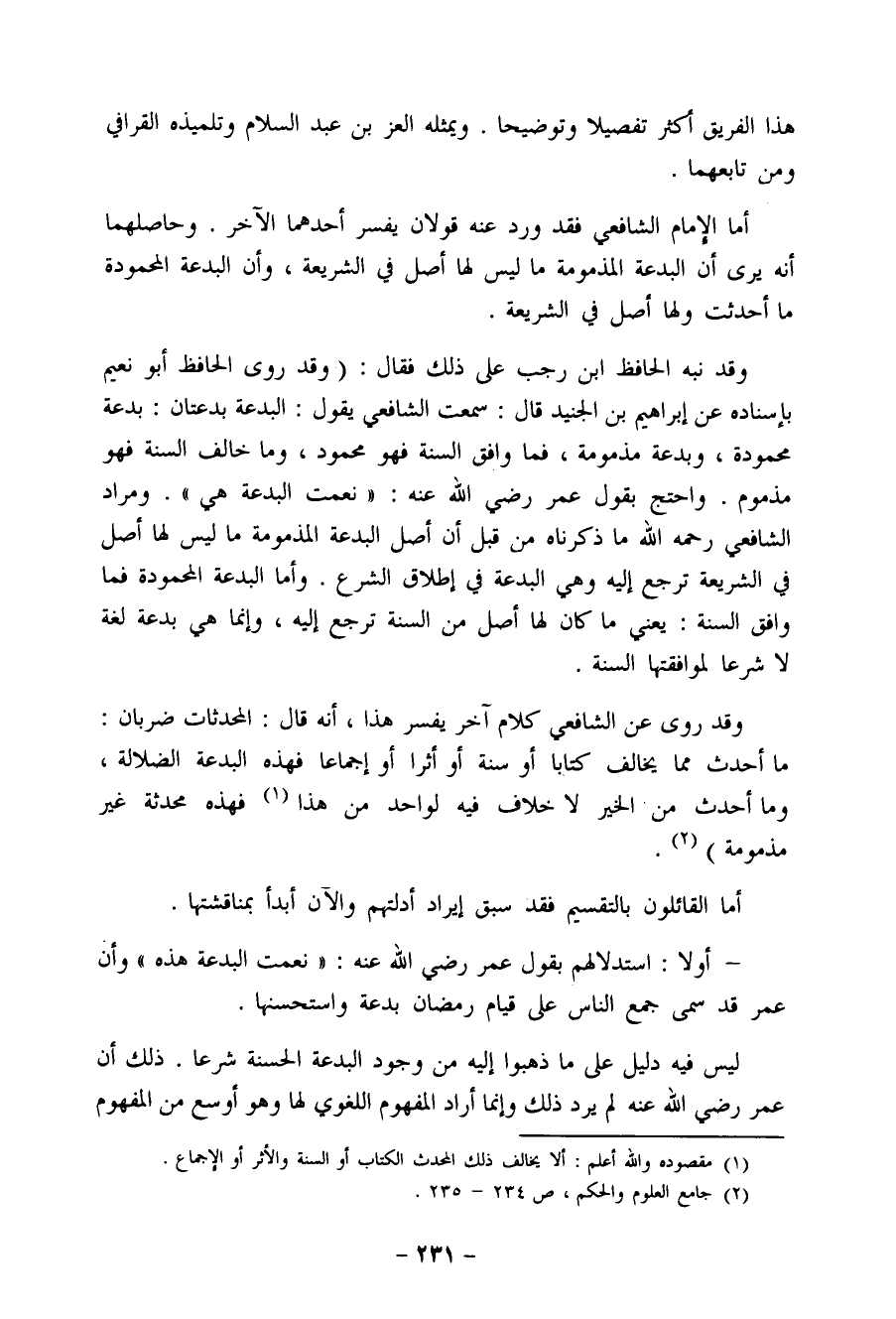 وقد نبه الحافظ ابن رجب على ذلك فقال: (وقد روى الحافظ أبو نعيم بإسناده عن إبراهيم بن الجنيد قال: سمعت الشافعي يقول: البدعة بدعتان: بدعة محمودة، وبدعة مذمومة، فما وافق السنة فهو محمود، وما خالف السنة فهو مذموم. واحتج بقول عمر - رضي الله عنه: " نعمت البدعة هي ". ومراد الشافعي - رحمه الله - ما ذكرناه من قبل أن أصل البدعة المذمومة ما ليس لها أصل في الشريعة ترجع إليه وهي البدعة في إطلاق الشرع. وأما البدعة المحمودة فما وافق السنة: يعني ما كان لها أصل من السنة ترجع إليه، وإنما هي بدعة لغة لا شرعا لموافقتها السنة.