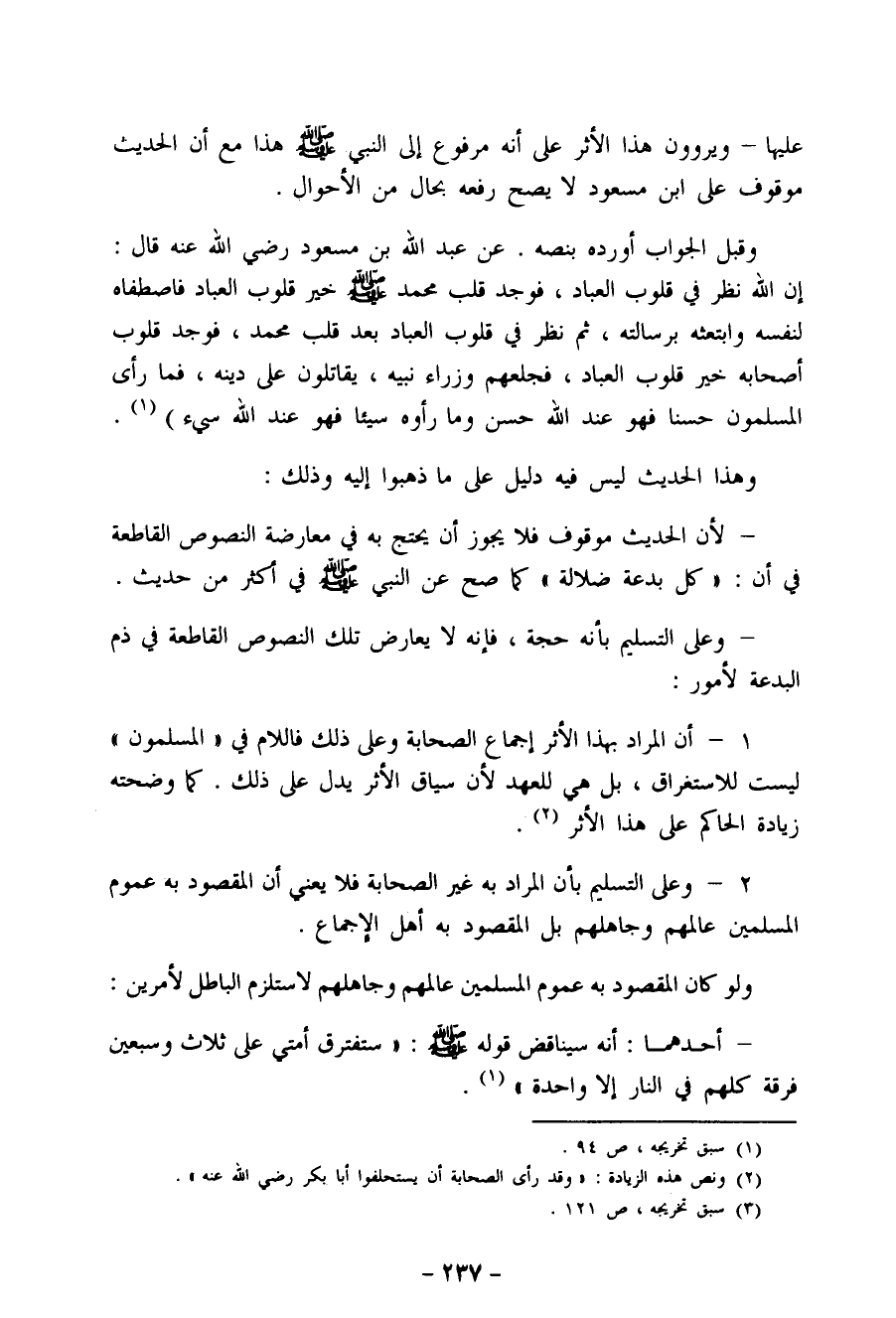 - لأن الحديث موقوف فلا يجوز أن يحتج به في معارضة النصوص القاطعة في أن: «كل بدعة ضلالة» كما صح عن النبي - صلى الله عليه وسلم - في أكثر من حديث.