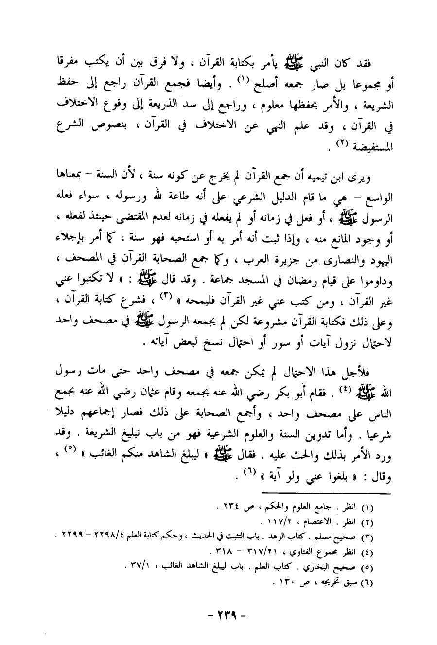 ويرى ابن تيمية أن جمع القرآن لم يخرج عن كونه سنة، لأن السنة - بمعناها الواسع - هي ما قام الدليل الشرعي على أنه طاعة لله ورسوله، سواء فعله الرسول - صلى الله عليه وسلم -، أو فعل في زمانه أو لم يفعله في زمانه لعدم المقتضى حينئذ لفعله، أو وجود المانع منه، وإذا ثبت أنه أمر به أو استحبه فهو سنة، كما أمر بإجلاء اليهود والنصارى من جزيرة العرب، وكما جمع الصحابة القرآن في المصحف، وداوموا على قيام رمضان في المسجد جماعة. وقد قال - صلى الله عليه وسلم -: «لا تكتبوا عني غير القرآن، ومن كتب عني غير القرآن فليمحه» (¬3) فشرع كتابة القرآن، وعلى ذلك فكتابة القرآن مشروعة لكن لم يجمعه الرسول - صلى الله عليه وسلم - في مصحف واحد لاحتمال نزول آيات أو سور أو احتمال نسخ لبعض آياته.
