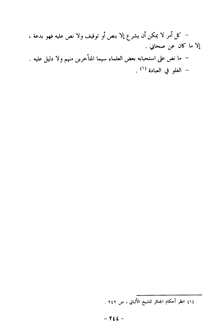 - كل أمر لا يمكن أن يشرع إلا بنص أو توقيف ولا نص عليه فهو بدعة، إلا ما كان عن صحابي.