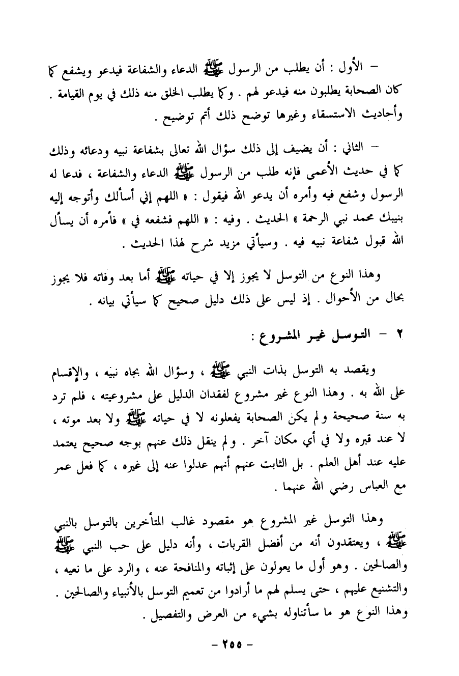 2 - التوسل غير المشروع: ويقصد به التوسل بذات النبي صلى الله عليه وسلم، وسؤال الله بجاه نبيه، والإقسام على الله به. وهذا النوع غير مشروع لفقدان الدليل على مشروعيته، فلم ترد به سنة صحيحة ولم يكن الصحابة يفعلونه لا في حياته صلى الله عليه وسلم ولا بعد موته، لا عند قبره ولا في أي مكان آخر. ولم ينقل ذلك عنهم بوجه صحيح يعتمد عليه عند أهل العلم. بل الثابت عنهم أنهم عدلوا عنه إلى غيره، كما فعل عمر مع العباس رضي الله عنهما.