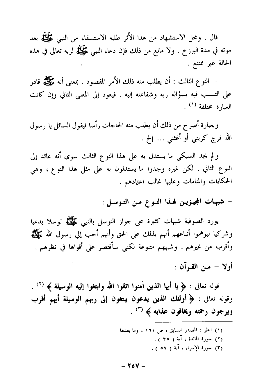 - النوع الثالث: أن يطلب منه ذلك الأمر المقصود. بمعنى أنه صلى الله عليه وسلم قادر على التسبب فيه بسؤاله ربه وشفاعته إليه. فيعود إلى المعنى الثاني وإن كانت العبارة مختلفة (¬1) .