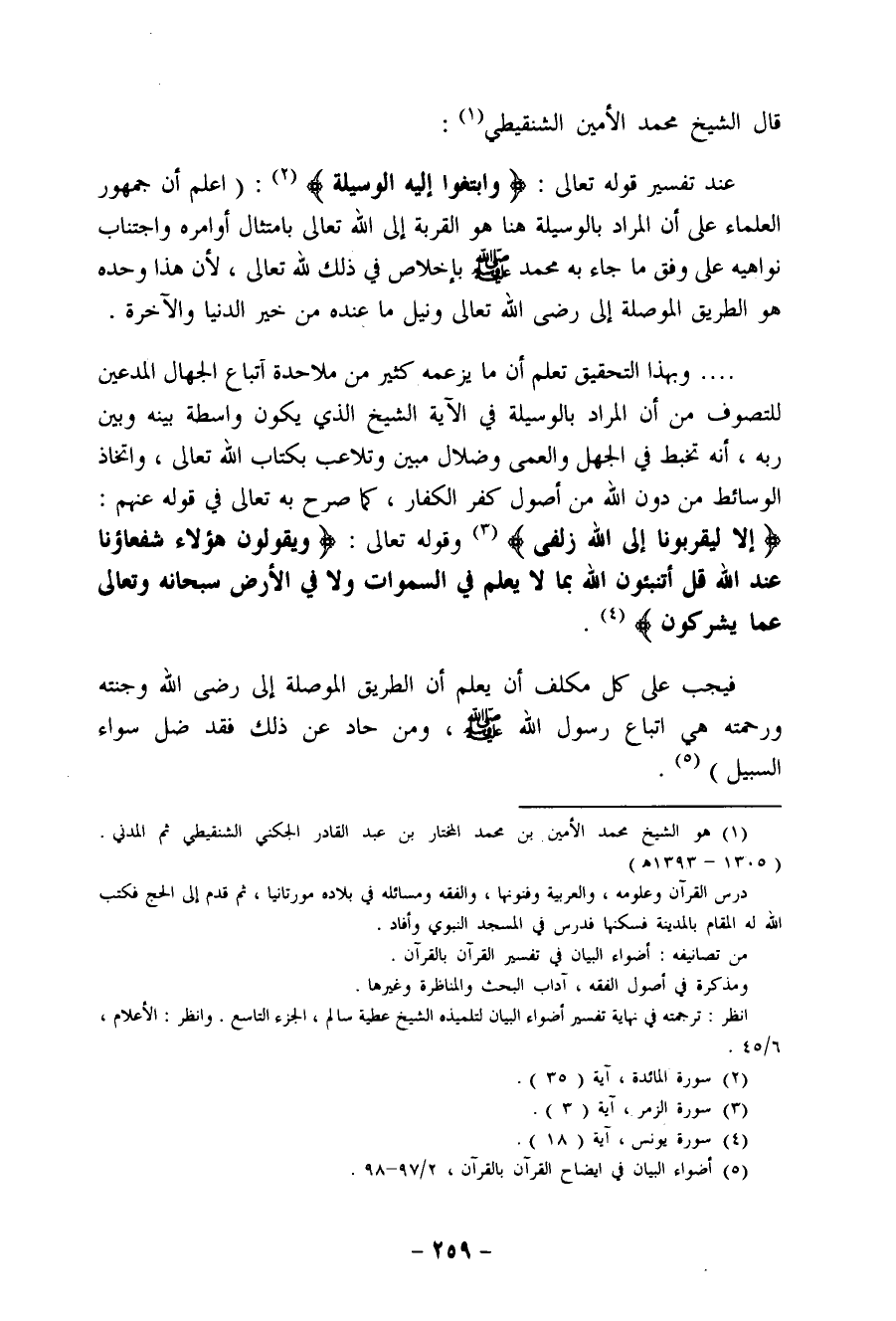 . . . . وبهذا التحقيق تعلم أن ما يزعمه كثير من ملاحدة أتباع الجهال المدعين للتصوف من أن المراد بالوسيلة في الآية الشيخ الذي يكون واسطة بينه وبين ربه، أنه تخبط في الجهل والعمى وضلال مبين وتلاعب بكتاب الله تعالى، واتخاذ الوسائط من دون الله من أصول كفر الكفار، كما صرح به تعالى في قوله عنهم: {إِلَّا لِيُقَرِّبُونَا إِلَى اللَّهِ زُلْفَى} [الزمر: 3] (¬3) وقوله تعالى: {وَيَقُولُونَ هَؤُلَاءِ شُفَعَاؤُنَا عِنْدَ اللَّهِ قُلْ أَتُنَبِّئُونَ اللَّهَ بِمَا لَا يَعْلَمُ فِي السَّمَاوَاتِ وَلَا فِي الْأَرْضِ سُبْحَانَهُ وَتَعَالَى عَمَّا يُشْرِكُونَ} [يونس: 18] (¬4) فيجب على كل مكلف أن يعلم أن الطريق الموصلة إلى رضى الله وجنته ورحمته هي اتباع رسول الله صلى الله عليه وسلم، ومن حاد عن ذلك فقد ضل سواء السبيل) (¬5) .