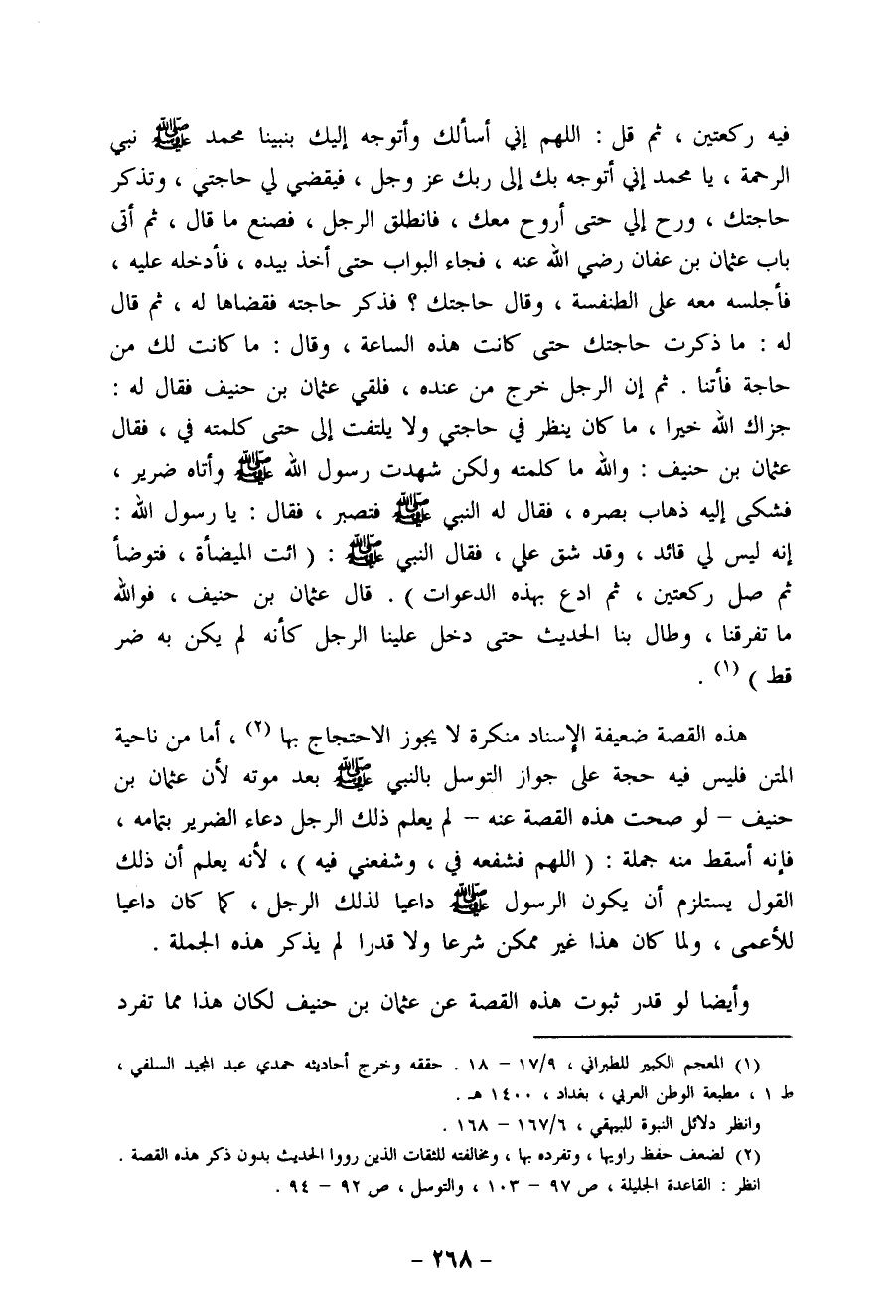 هذه القصة ضعيفة الإسناد منكرة لا يجوز الاحتجاج بها (¬2) أما من ناحية المتن فليس فيه حجة على جواز التوسل بالنبي صلى الله عليه وسلم بعد موته لأن عثمان بن حنيف - لو صحت هذه القصة عنه - لم يعلم ذلك الرجل دعاء الضرير بتمامه، فإنه أسقط منه جملة: «اللهم فشفعه في، وشفعني فيه» ، لأنه يعلم أن ذلك القول يستلزم أن يكون الرسول صلى الله عليه وسلم داعيا لذلك الرجل، كما كان داعيا للأعمى، ولما كان هذا غير ممكن شرعا ولا قدرا لم يذكر هذه الجملة.
