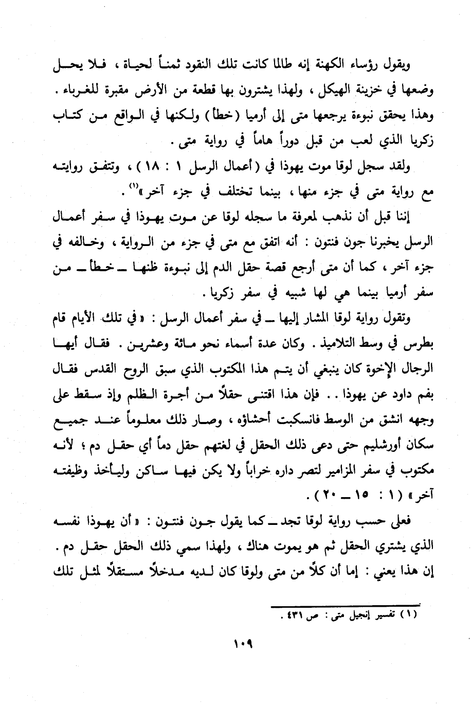 ويقول رؤساء الكهنة إنه طالما كانت تلك النقود ثمنا لحياة، فلا يحل وضعها في خزينة الهيكل، ولهذا يشترون بها قطعة من الأرض مقبرة للغرباء. وهذا يحقق نبوءة يرجعها متى إلى أرميا (خطأ) ولكنها في الواقع من كتاب زكريا الذي لعب من قبل دورا هاما في رواية متى.