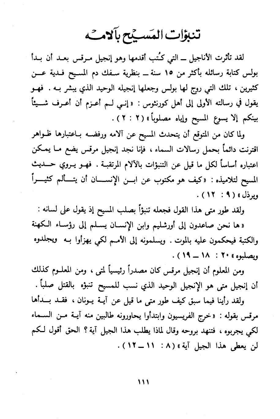 ولما كان من المتوقع أن يتحدث المسيح عن آلامه ورفضه باعتبارها ظواهر اقترنت دائما بحمل رسالات السماء، فإنا نجد إنجيل مرقس يضع ما يمكن اعتباره أساسا لكل ما قيل عن التنبؤات بالآلام المرتقبة. فهو يروي حديث المسيح لتلاميذه: " كيف هو مكتوب عن ابن الإنسان أن يتألم كثيرا ويرذل " (9: 12) .