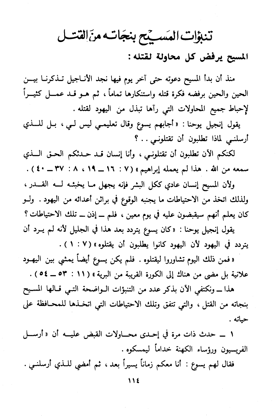 هذا - ونكتفي الآن بذكر عدد من التنبؤات الواضحة التي قالها المسيح بنجاته من القتل، والتي تتفق وتلك الاحتياطات التي اتخذها للمحافظة على حياته.