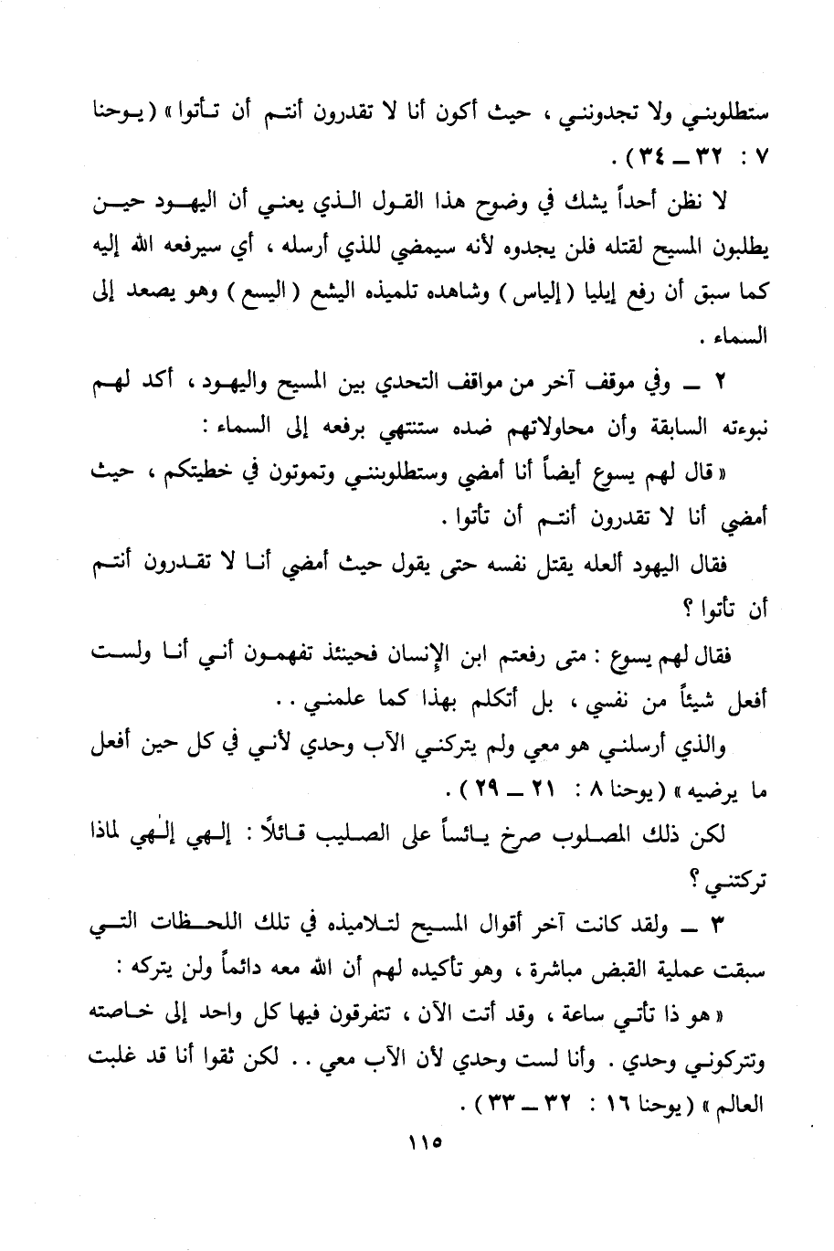لا نظن أحدا يشك في وضوح هذا القول الذي يعني أن اليهود حين يطلبون المسيح لقتله فلن يجدوه لأنه سيمضي للذي أرسله، أي سيرفعه الله إِليه كما سبق أن رفع إيليا (إلياس) وشاهده تلميذه اليشع (اليسع) وهو يصعد إلى السماء.
